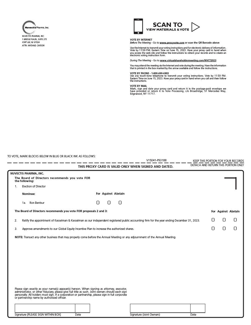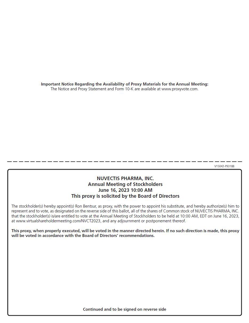 NUVECTIS PHARMA, INC. 1 BRIDGE PLAZA, SUITE 275 FORT LEE, NJ 07024 ATTN: MICHAEL CARSON SCAN TO VIEW MATERIALS & VOTE VOTE BY INTERNET Before The Meeting - Go to www.proxyvote.com or scan the QR Barcode above Use the Internet to transmit your voting instructions and for electronic delivery of information. Vote by 11:59 P.M. Eastern Time on June 15, 2023. Have your proxy card in hand when you access the web site and follow the instructions to obtain your records and to create an electronic voting instruction form. During The Meeting - Go to www.virtualshareholdermeeting.com/NVCT2023 You may attend the meeting via the Internet and vote during the meeting. Have the information that is printed in the box marked by the arrow available and follow the instructions. VOTE BY PHONE - 1-800-690-6903 Use any touch-tone telephone to transmit your voting instructions. Vote by 11:59 P.M. Eastern Time on June 15, 2023. Have your proxy card in hand when you call and then follow the instructions. VOTE BY MAIL Mark, sign and date your proxy card and return it in the postage-paid envelope we have provided or return it to Vote Processing, c/o Broadridge, 51 Mercedes Way, Edgewood, NY 11717. TO VOTE, MARK BLOCKS BELOW IN BLUE OR BLACK INK AS FOLLOWS: V15041-P93188 KEEP THIS PORTION FOR YOUR RECORDS THIS PROXY CARD IS VALID ONLY WHEN SIGNED AND DATED. DETACH AND RETURN THIS PORTION ONLY NUVECTIS PHARMA, INC. The Board of Directors recommends you vote FOR the following: 1. Election of Director Nominee: For Against Abstain 1a. Ron Bentsur ! ! ! The Board of Directors recommends you vote FOR proposals 2 and 3: For Against Abstain 2. Ratify the appointment of Kesselman & Kesselman as our independent registered public accounting firm for the year ending December 31, 2023. 3. Approve amendments to our Global Equity Incentive Plan to increase the authorized shares. ! ! ! ! ! ! NOTE: Transact any other business that may properly come before the Annual Meeting or any adjournment of the Annual Meeting. Please sign exactly as your name(s) appear(s) hereon. When signing as attorney, executor, administrator, or other fiduciary, please give full title as such. Joint owners should each sign personally. All holders must sign. If a corporation or partnership, please sign in full corporate or partnership name by authorized officer. Signature [PLEASE SIGN WITHIN BOX] Date Signature (Joint Owners) Date
