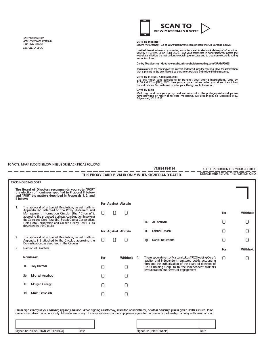 You are invited to attend the 2023 annual general and special meeting (the “Meeting”) of the holders (“TPCO Shareholders”) of common shares (“TPCO Shares”) of TPCO Holding Corp. (“TPCO” or the “Company”). The Meeting will be held at noon (New York City time) on [●], [●], 2023 via live audio webcast online at www.virtualshareholdermeeting.com/GRAMF2023. At the Meeting, you will be asked, among other things, to consider a special resolution to approve the proposed business combination (the “Business Combination”) involving TPCO, Gold Flora, LLC (“Gold Flora”), Stately Capital Corporation (“Stately”), Gold Flora Corporation (“Newco”) and Golden Grizzly Bear LLC (“US Merger Sub”) in accordance with the terms and conditions of a business combination agreement entered into among TPCO, Gold Flora, Stately, Newco and US Merger Sub dated February 21, 2023 (the “Business Combination Agreement”) and an agreement and plan of merger entered into by Newco, US Merger Sub and Gold Flora dated February 21, 2023 (the “Agreement and Plan of Merger”).