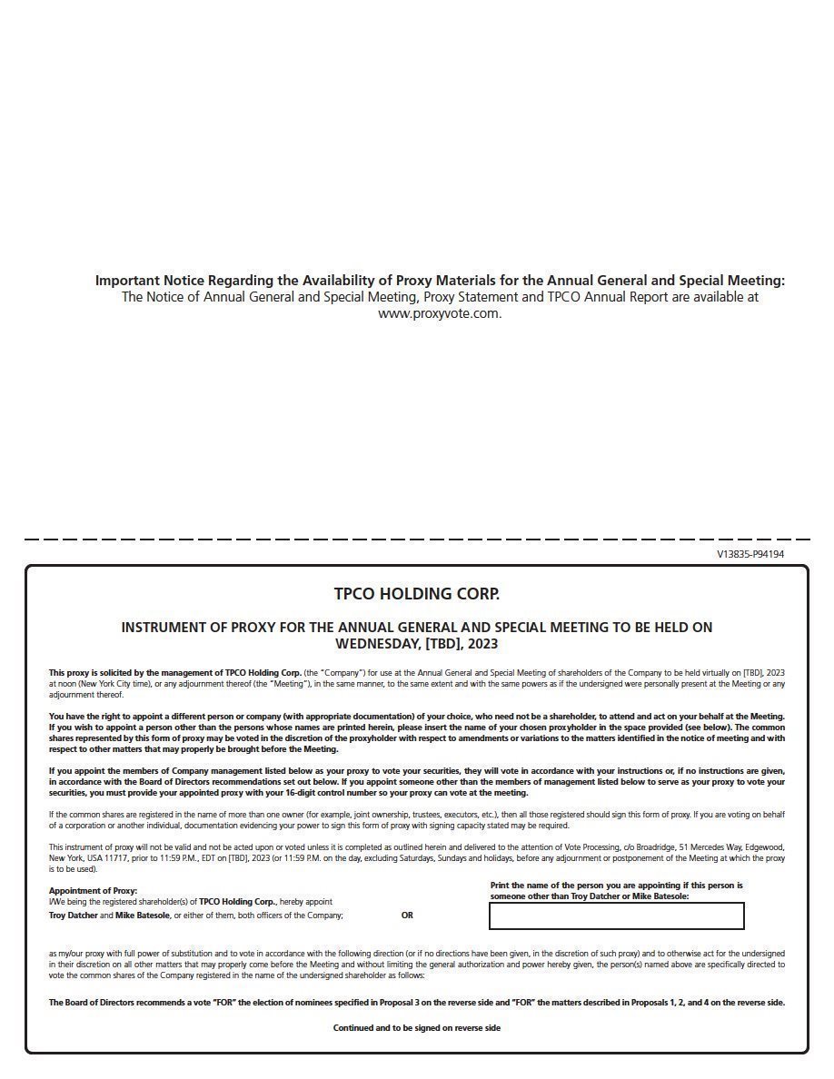 These materials are important and require your immediate attention. They require holders (the “TPCO Shareholders”) of common shares of TPCO Holding Corp. (“TPCO”) to make important decisions. If you are in doubt as to how to make such decisions, please contact your financial, legal or other professional advisor.