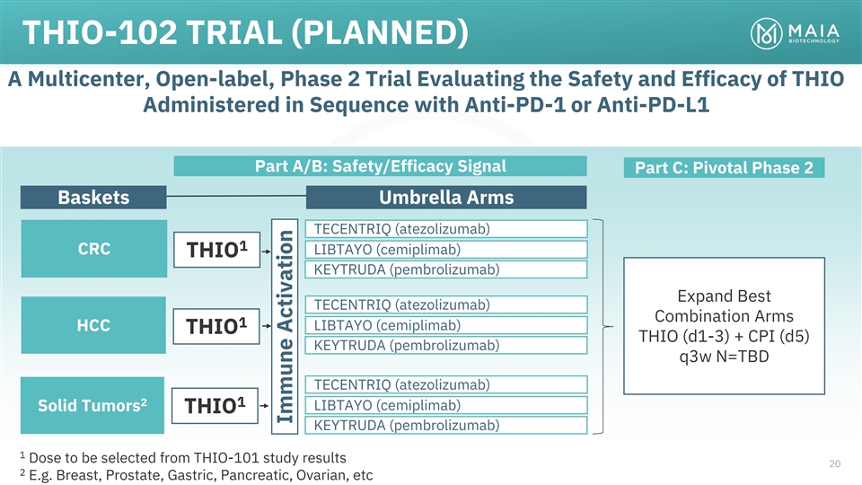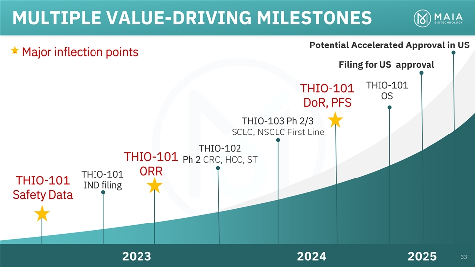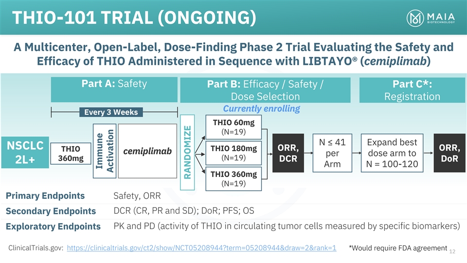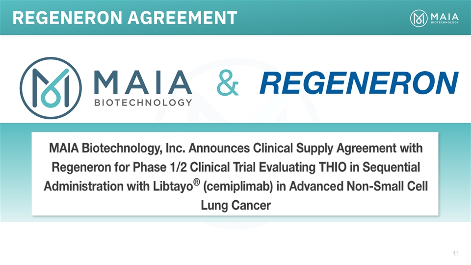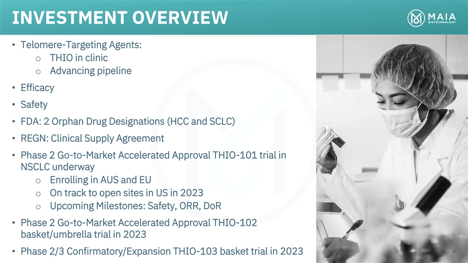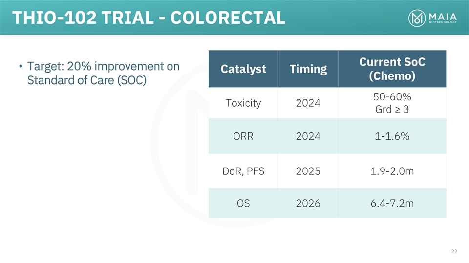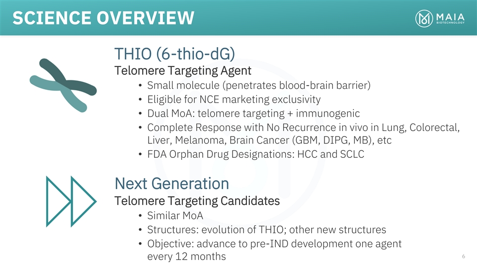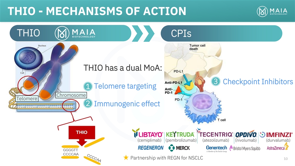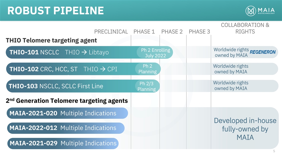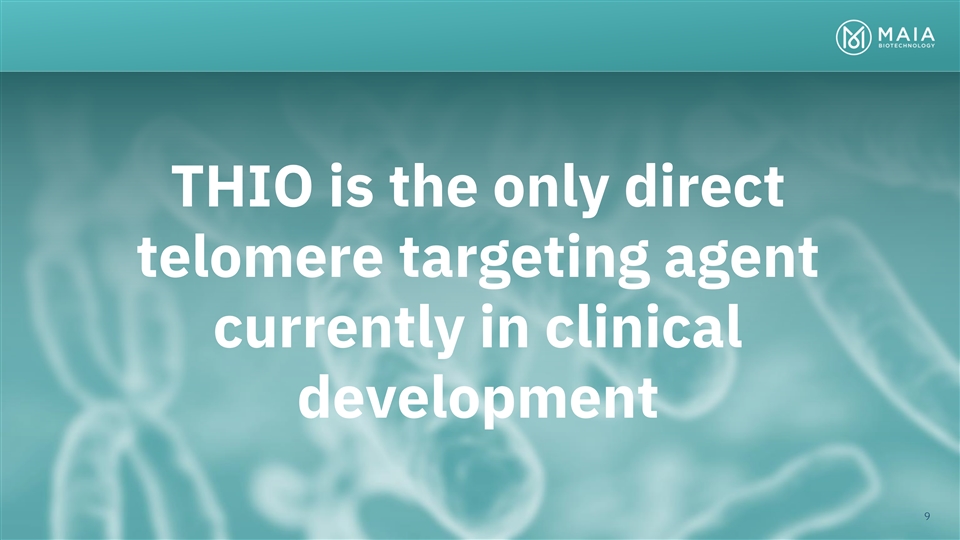 ROBUST PIPELINE COLLABORATION & PRECLINICAL PHASE 1 PHASE 2 PHASE 3 RIGHTS THIO Telomere targeting agent Worldwide rights Ph 2 Enrolling THIO-101 NSCLC THIO → Libtayo owned by MAIA July 2022 Ph 2 Worldwide rights THIO-102 CRC, HCC, ST THIO → CPI Planning owned by MAIA Worldwide rights Ph 2/3 THIO-103 NSCLC, SCLC First Line owned by MAIA Planning nd 2 Generation Telomere targeting agents MAIA-2021-020 Multiple Indications Developed in-house MAIA-2022-012 Multiple Indications fully-owned by MAIA MAIA-2021-029 Multiple Indications 5