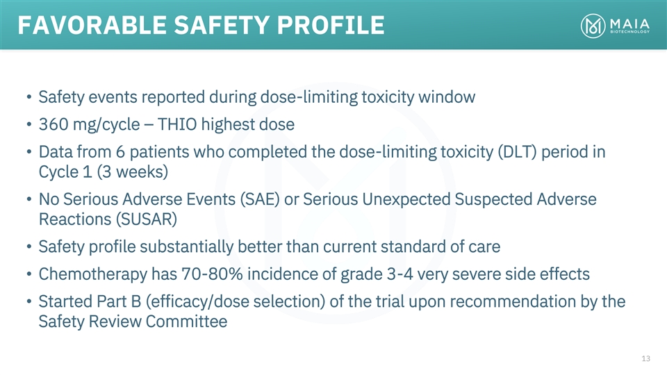 THIO-101 TRIAL (ONGOING) A Multicenter, Open-Label, Dose-Finding Phase 2 Trial Evaluating the Safety and Efficacy of THIO Administered in Sequence with LIBTAYO® (cemiplimab) Part A: Safety Part B: Efficacy / Safety / Part C*: Dose Selection Registration Currently enrolling Every 3 Weeks THIO 60mg (N=19) N ≤ 41 Expand best NSCLC ORR, ORR, THIO 180mg THIO cemiplimab per dose arm to (N=19) 360mg DCR DoR 2L+ Arm N = 100-120 THIO 360mg (N=19) Primary Endpoints Safety, ORR DCR (CR, PR and SD); DoR; PFS; OS Secondary Endpoints PK and PD (activity of THIO in circulating tumor cells measured by specific biomarkers) Exploratory Endpoints ClinicalTrials.gov: https://clinicaltrials.gov/ct2/show/NCT05208944?term=05208944&draw=2&rank=1 *Would require FDA agreement 12 Immune Activation RANDOMIZE