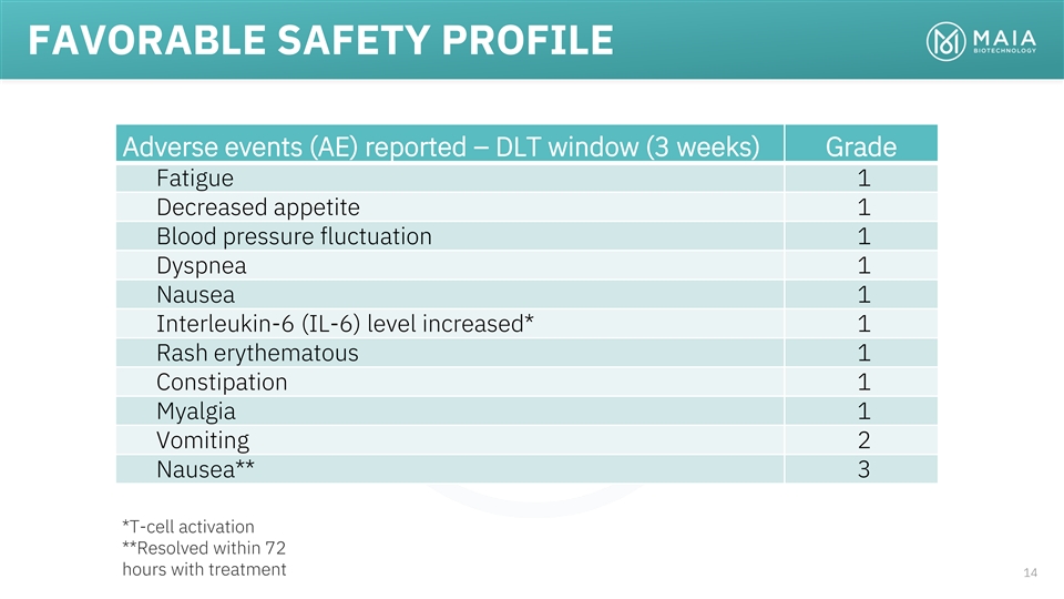 FAVORABLE SAFETY PROFILE • Safety events reported during dose-limiting toxicity window • 360 mg/cycle – THIO highest dose • Data from 6 patients who completed the dose-limiting toxicity (DLT) period in Cycle 1 (3 weeks) • No Serious Adverse Events (SAE) or Serious Unexpected Suspected Adverse Reactions (SUSAR) • Safety profile substantially better than current standard of care • Chemotherapy has 70-80% incidence of grade 3-4 very severe side effects • Started Part B (efficacy/dose selection) of the trial upon recommendation by the Safety Review Committee 13