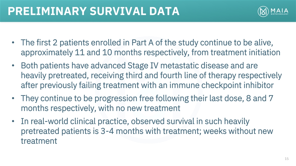 PRELIMINARY SURVIVAL DATA • The first 2 patients enrolled in Part A of the study continue to be alive, approximately 11 and 10 months respectively, from treatment initiation • Both patients have advanced Stage IV metastatic disease and are heavily pretreated, receiving third and fourth line of therapy respectively after previously failing treatment with an immune checkpoint inhibitor • They continue to be progression free following their last dose, 8 and 7 months respectively, with no new treatment • In real-world clinical practice, observed survival in such heavily pretreated patients is 3-4 months with treatment; weeks without new treatment 15