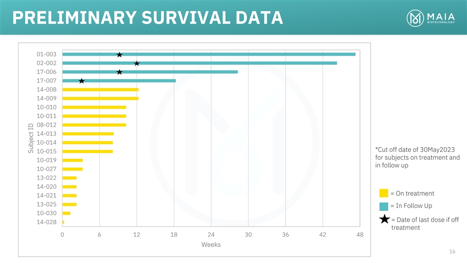 PRELIMINARY SURVIVAL DATA 01-003 02-002 17-006 17-007 14-008 14-009 10-010 10-011 08-012 14-013 10-014 *Cut off date of 30May2023 10-015 for subjects on treatment and 10-019 in follow up 10-027 13-022 14-020 = On treatment 14-021 13-025 = In Follow Up 10-030 = Date of last dose if off 14-028 treatment 0 6 12 18 24 30 36 42 48 Weeks 16 Subject ID