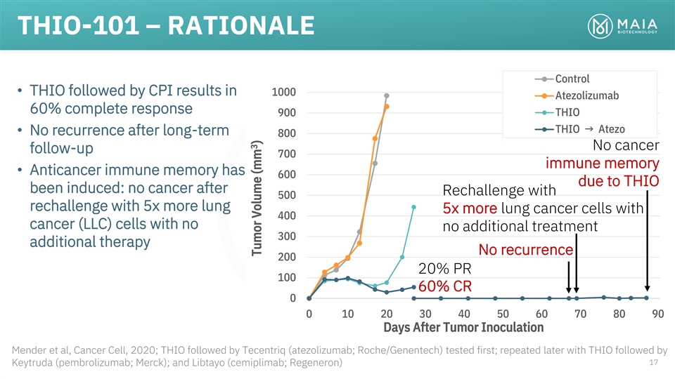 THIO-101 – RATIONALE Control • THIO followed by CPI results in 1000 Atezolizumab 60% complete response THIO 900 THIO → Atezo • No recurrence after long-term 800 No cancer follow-up 700 immune memory • Anticancer immune memory has 600 due to THIO been induced: no cancer after Rechallenge with 500 rechallenge with 5x more lung 5x more lung cancer cells with 400 cancer (LLC) cells with no no additional treatment 300 additional therapy No recurrence 200 20% PR 100 60% CR 0 0 10 20 30 40 50 60 70 80 90 Days After Tumor Inoculation Mender et al, Cancer Cell, 2020; THIO followed by Tecentriq (atezolizumab; Roche/Genentech) tested first; repeated later with THIO followed by 17 Keytruda (pembrolizumab; Merck); and Libtayo (cemiplimab; Regeneron) 3 Tumor Volume (mm )