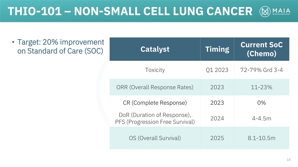 THIO-101 – NON-SMALL CELL LUNG CANCER • Target: 20% improvement Current SoC Catalyst Timing on Standard of Care (SOC) (Chemo) Toxicity Q1 2023 72-79% Grd 3-4 ORR (Overall Response Rates) 2023 11-23% CR (Complete Response) 2023 0% DoR (Duration of Response), 2024 4-4.5m PFS (Progression Free Survival) OS (Overall Survival) 2025 8.1-10.5m 18
