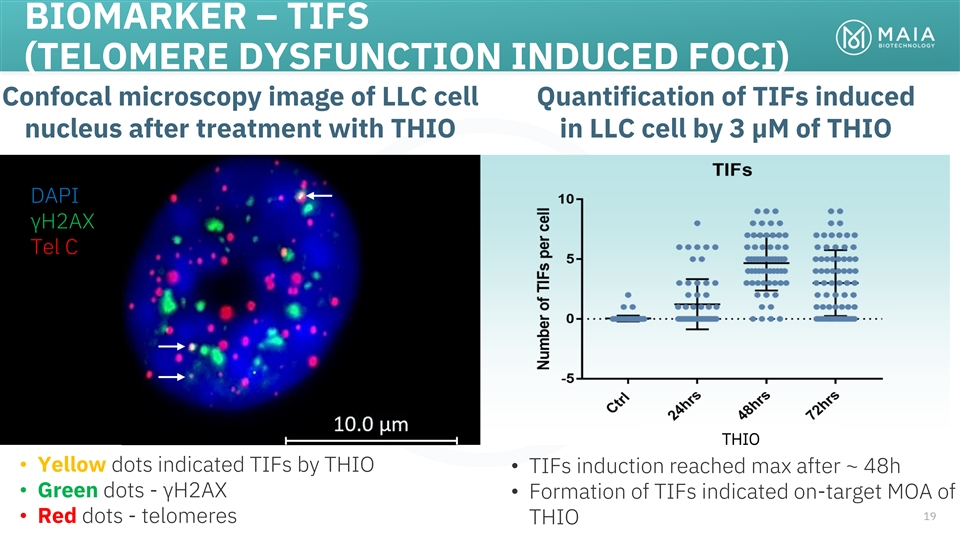 BIOMARKER – TIFS (TELOMERE DYSFUNCTION INDUCED FOCI) Confocal microscopy image of LLC cell Quantification of TIFs induced nucleus after treatment with THIO in LLC cell by 3 µM of THIO DAPI γH2AX Tel C THIO • Yellow dots indicated TIFs by THIO • TIFs induction reached max after ~ 48h • Green dots - γH2AX • Formation of TIFs indicated on-target MOA of 19 • Red dots - telomeres THIO