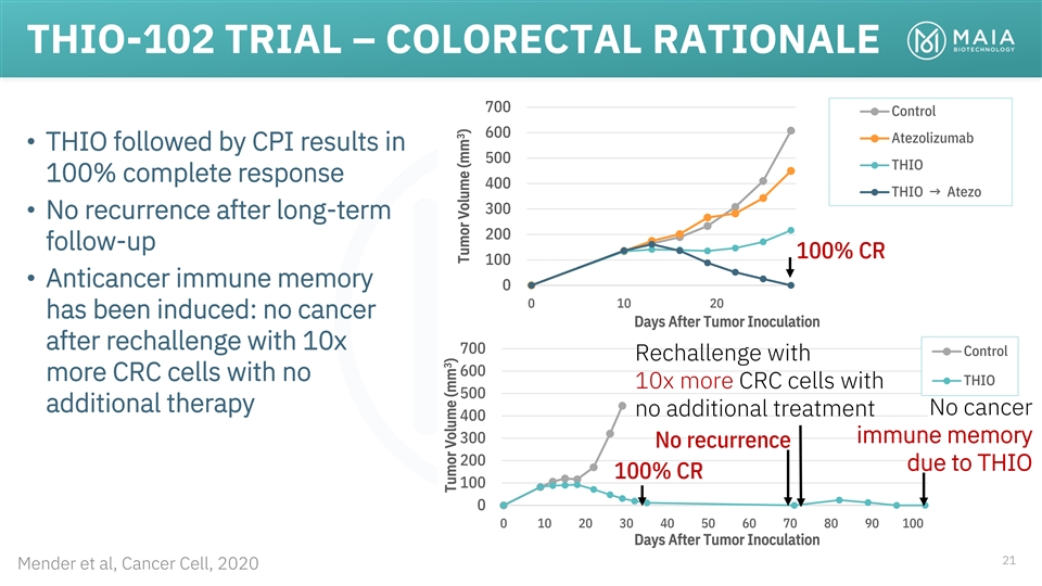 THIO-102 TRIAL – COLORECTAL RATIONALE 700 Control 600 Atezolizumab • THIO followed by CPI results in 500 THIO 100% complete response 400 THIO → Atezo 300 • No recurrence after long-term 200 follow-up 100% CR 100 • Anticancer immune memory 0 0 10 20 has been induced: no cancer Days After Tumor Inoculation after rechallenge with 10x 700 Control Rechallenge with 600 more CRC cells with no THIO 10x more CRC cells with 500 additional therapy No cancer no additional treatment 400 300 immune memory No recurrence 200 due to THIO 100% CR 100 0 0 10 20 30 40 50 60 70 80 90 100 Days After Tumor Inoculation 21 Mender et al, Cancer Cell, 2020 3 Tumor Volume (mm ) 3 Tumor Volume (mm )