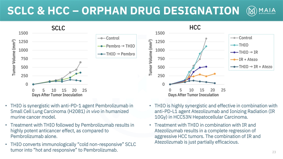 THIO-102 TRIAL - COLORECTAL Current SoC • Target: 20% improvement on Catalyst Timing (Chemo) Standard of Care (SOC) 50-60% Toxicity 2024 Grd ≥ 3 ORR 2024 1-1.6% DoR, PFS 2025 1.9-2.0m OS 2026 6.4-7.2m 22