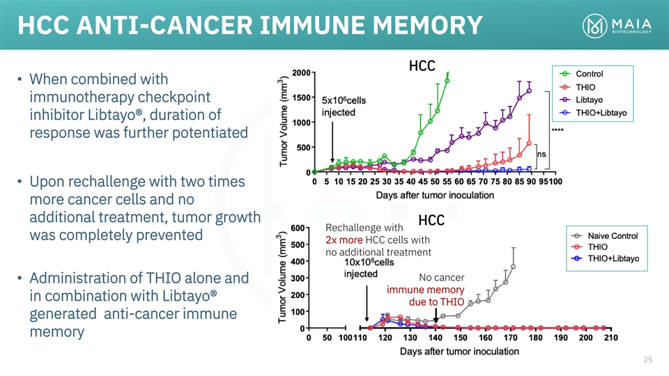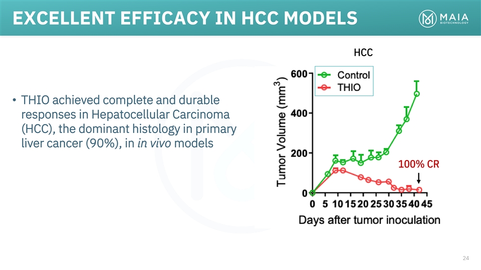 EXCELLENT EFFICACY IN HCC MODELS HCC • THIO achieved complete and durable responses in Hepatocellular Carcinoma (HCC), the dominant histology in primary liver cancer (90%), in in vivo models 100% CR 24
