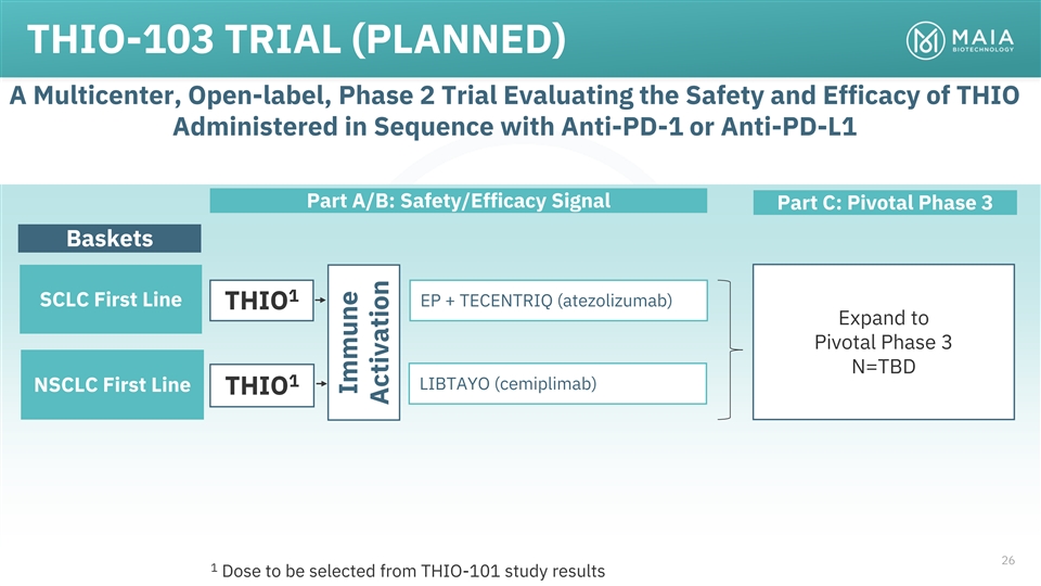 THIO-103 TRIAL (PLANNED) A Multicenter, Open-label, Phase 2 Trial Evaluating the Safety and Efficacy of THIO Administered in Sequence with Anti-PD-1 or Anti-PD-L1 Part A/B: Safety/Efficacy Signal Part C: Pivotal Phase 3 Baskets 1 SCLC First Line EP + TECENTRIQ (atezolizumab) THIO Expand to Pivotal Phase 3 N=TBD 1 LIBTAYO (cemiplimab) NSCLC First Line THIO 26 1 Dose to be selected from THIO-101 study results Immune Activation