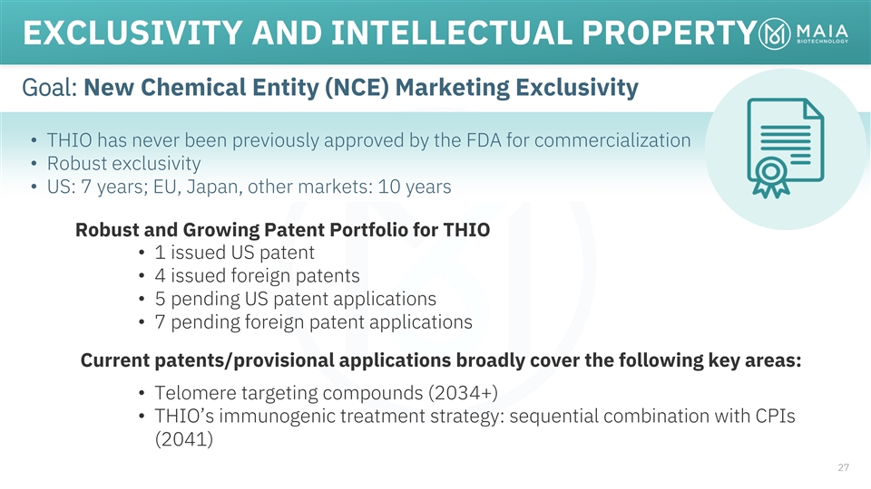 EXCLUSIVITY AND INTELLECTUAL PROPERTY Goal: New Chemical Entity (NCE) Marketing Exclusivity • THIO has never been previously approved by the FDA for commercialization • Robust exclusivity • US: 7 years; EU, Japan, other markets: 10 years Robust and Growing Patent Portfolio for THIO • 1 issued US patent • 4 issued foreign patents • 5 pending US patent applications • 7 pending foreign patent applications Current patents/provisional applications broadly cover the following key areas: • Telomere targeting compounds (2034+) • THIO’s immunogenic treatment strategy: sequential combination with CPIs (2041) 27