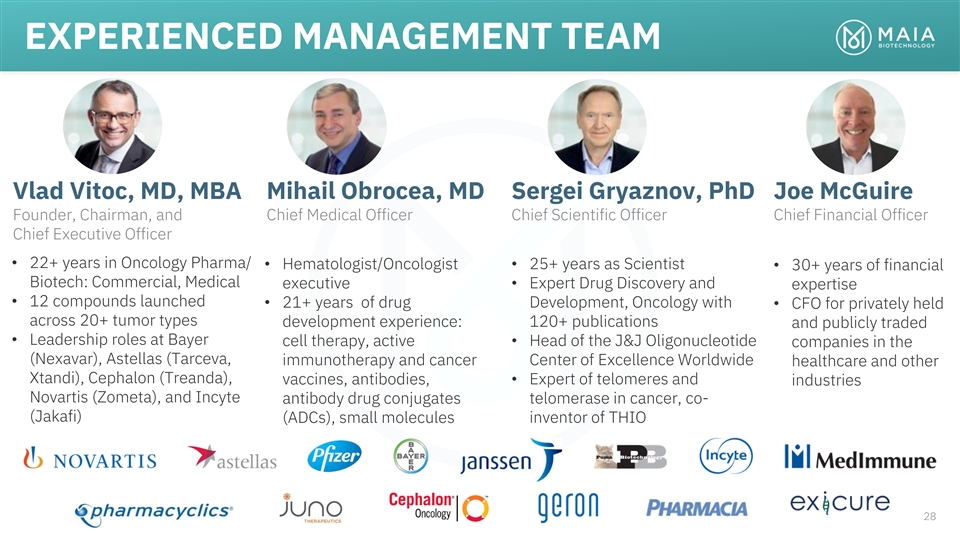 EXPERIENCED MANAGEMENT TEAM Vlad Vitoc, MD, MBA Mihail Obrocea, MD Sergei Gryaznov, PhD Joe McGuire Founder, Chairman, and Chief Medical Officer Chief Scientific Officer Chief Financial Officer Chief Executive Officer • 22+ years in Oncology Pharma/ • Hematologist/Oncologist • 25+ years as Scientist • 30+ years of financial Biotech: Commercial, Medical • Expert Drug Discovery and executive expertise • 12 compounds launched • 21+ years of drug Development, Oncology with • CFO for privately held across 20+ tumor types development experience: 120+ publications and publicly traded • Leadership roles at Bayer cell therapy, active • Head of the J&J Oligonucleotide companies in the (Nexavar), Astellas (Tarceva, immunotherapy and cancer Center of Excellence Worldwide healthcare and other Xtandi), Cephalon (Treanda), • Expert of telomeres and vaccines, antibodies, industries Novartis (Zometa), and Incyte antibody drug conjugates telomerase in cancer, co- (Jakafi) (ADCs), small molecules inventor of THIO 28