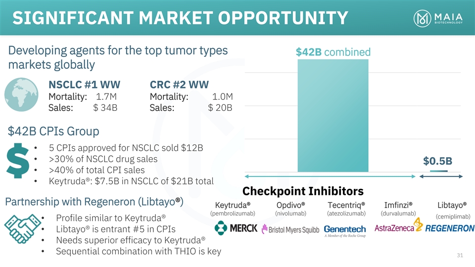 SIGNIFICANT MARKET OPPORTUNITY Developing agents for the top tumor types $42B combined markets globally NSCLC #1 WW CRC #2 WW Mortality: 1.7M Mortality: 1.0M Sales: $ 34B Sales: $ 20B $42B CPIs Group • 5 CPIs approved for NSCLC sold $12B • >30% of NSCLC drug sales $0.5B • >40% of total CPI sales Category 1 Category 1 • Keytruda®: $7.5B in NSCLC of $21B total Checkpoint Inhibitors Partnership with Regeneron (Libtayo®) Keytruda® Opdivo® Tecentriq® Imfinzi® Libtayo® (pembrolizumab) (nivolumab) (atezolizumab) (durvalumab) (cemiplimab) • Profile similar to Keytruda® • Libtayo® is entrant #5 in CPIs • Needs superior efficacy to Keytruda® • Sequential combination with THIO is key 31