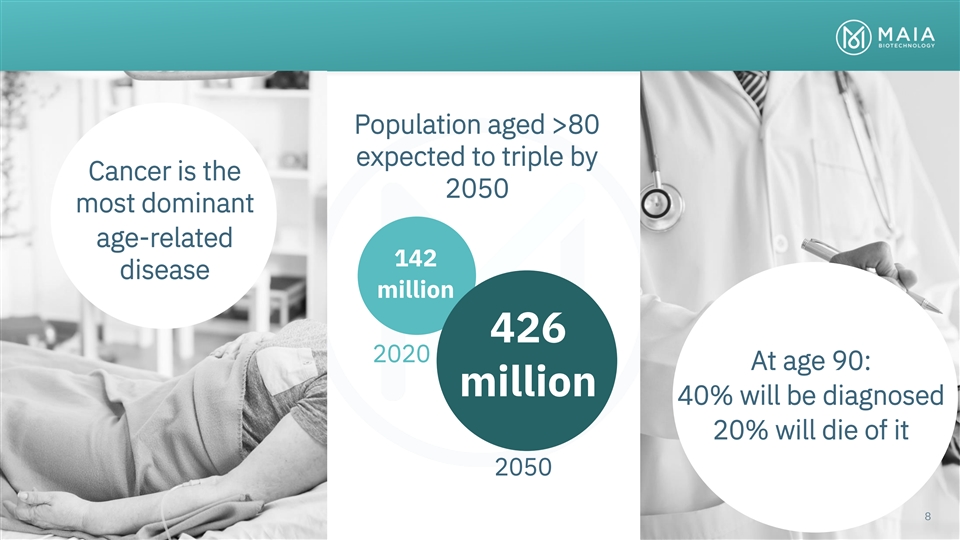Population aged >80 expected to triple by Cancer is the 2050 most dominant age-related 142 disease million 426 Cancer is the most dominant of the age-related disease categories and has 2020 At age 90: life altering impacts in the lives of patients and their close ones million 40% will be diagnosed 20% will die of it 2050 88