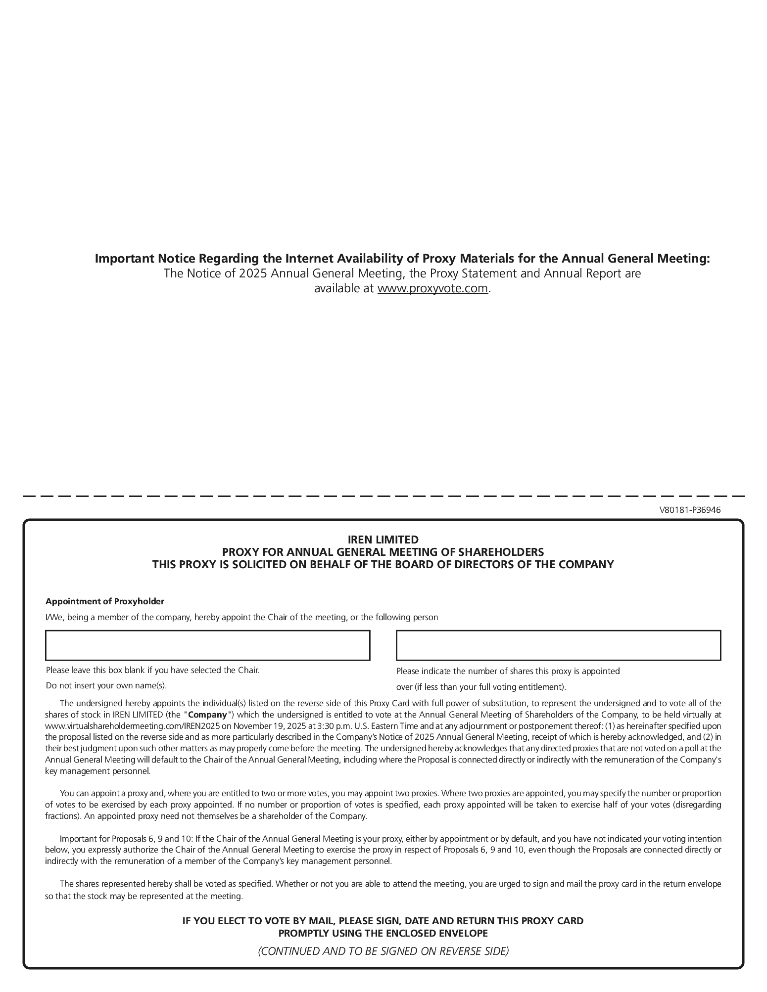 As detailed in the Notice of Meeting and the Proxy Statement, in order to vote, you must either attend the AGM via the online web link or by lodging your proxy or direct vote prior to the AGM. If you vote by proxy, you must submit your proxy card no later than November 18, 2025 11:59pm (ET). Instructions on how to lodge your proxy online are in the enclosed Notice of Meeting, the proxy card or voting instruction form and at www.proxyvote.com.