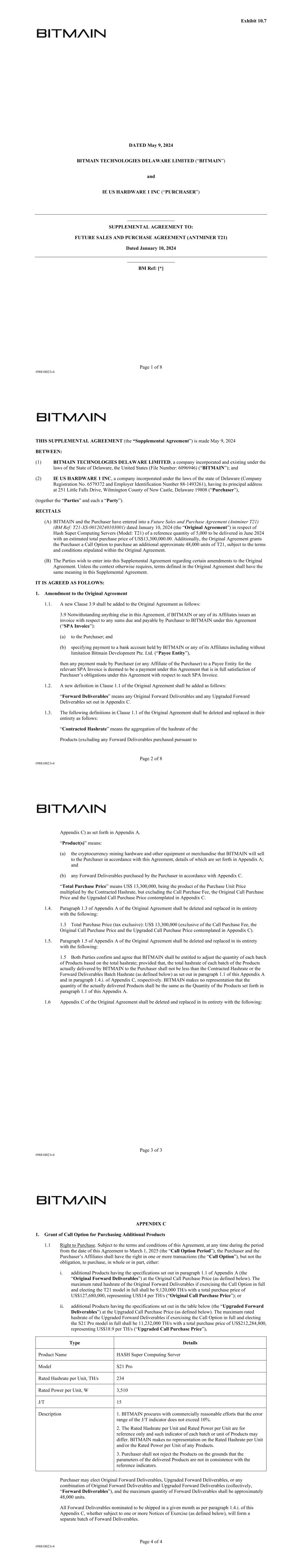 Exhibit 10.7 Page 1 of 8 #98810023v4 DATED May 9, 2024 BITMAIN TECHNOLOGIES DELAWARE LIMITED (“BITMAIN”) and IE US HARDWARE 1 INC (“PURCHASER”) SUPPLEMENTAL AGREEMENT TO: FUTURE SALES AND PURCHASE AGREEMENT (ANTMINER T21) Dated January 10, 2024 BM Ref: [*] Page 2 of 8 #98810023v4 THIS SUPPLEMENTAL AGREEMENT (the “Supplemental Agreement”) is made May 9, 2024 BETWEEN: (1) BITMAIN TECHNOLOGIES DELAWARE LIMITED, a company incorporated and existing under the laws of the State of Delaware, the United States (File Number: 6096946) (“BITMAIN”); and (2) IE US HARDWARE 1 INC, a company incorporated under the laws of the state of Delaware (Company Registration No. 6579372 and Employer Identification Number 88-1493261), having its principal address at 251 Little Falls Drive, Wilmington County of New Castle, Delaware 19808 (“Purchaser”), (together the “Parties” and each a “Party”). RECITALS (A) BITMAIN and the Purchaser have entered into a Future Sales and Purchase Agreement (Antminer T21) (BM Ref: T21-XS-00120240103001) dated January 10, 2024 (the “Original Agreement”) in respect of Hash Super Computing Servers (Model: T21) of a reference quantity of 5,000 to be delivered in June 2024 with an estimated total purchase price of US$13,300,000.00. Additionally, the Original Agreement grants the Purchaser a Call Option to purchase an additional approximate 48,000 units of T21, subject to the terms and conditions stipulated within the Original Agreement. (B) The Parties wish to enter into this Supplemental Agreement regarding certain amendments to the Original Agreement. Unless the context otherwise requires, terms defined in the Original Agreement shall have the same meaning in this Supplemental Agreement. IT IS AGREED AS FOLLOWS: 1. Amendment to the Original Agreement 1.1. A new Clause 3.9 shall be added to the Original Agreement as follows: 3.9 Notwithstanding anything else in this Agreement, if BITMAIN or any of its Affiliates issues an invoice with respect to any sums due and payable by Purchaser to BITMAIN under this Agreement (“SPA Invoice”): (a) to the Purchaser; and (b) specifying payment to a bank account held by BITMAIN or any of its Affiliates including without limitation Bitmain Development Pte. Ltd. (“Payee Entity”), then any payment made by Purchaser (or any Affiliate of the Purchaser) to a Payee Entity for the relevant SPA Invoice is deemed to be a payment under this Agreement that is in full satisfaction of Purchaser’s obligations under this Agreement with respect to such SPA Invoice. 1.2. A new definition in Clause 1.1 of the Original Agreement shall be added as follows: “Forward Deliverables” means any Original Forward Deliverables and any Upgraded Forward Deliverables set out in Appendix C. 1.3. The following definitions in Clause 1.1 of the Original Agreement shall be deleted and replaced in their entirety as follows: “Contracted Hashrate” means the aggregation of the hashrate of the Products (excluding any Forward Deliverables purchased pursuant to Page 3 of 3 #98810023v4 Appendix C) as set forth in Appendix A. “Product(s)” means: (a) the cryptocurrency mining hardware and other equipment or merchandise that BITMAIN will sell to the Purchaser in accordance with this Agreement, details of which are set forth in Appendix A; and (b) any Forward Deliverables purchased by the Purchaser in accordance with Appendix C. “Total Purchase Price” means US$ 13,300,000, being the product of the Purchase Unit Price multiplied by the Contracted Hashrate, but excluding the Call Purchase Fee, the Original Call Purchase Price and the Upgraded Call Purchase Price contemplated in Appendix C. 1.4. Paragraph 1.3 of Appendix A of the Original Agreement shall be deleted and replaced in its entirety with the following: 1.3 Total Purchase Price (tax exclusive): US$ 13,300,000 (exclusive of the Call Purchase Fee, the Original Call Purchase Price and the Upgraded Call Purchase Price contemplated in Appendix C). 1.5. Paragraph 1.5 of Appendix A of the Original Agreement shall be deleted and replaced in its entirety with the following: 1.5 Both Parties confirm and agree that BITMAIN shall be entitled to adjust the quantity of each batch of Products based on the total hashrate; provided that, the total hashrate of each batch of the Products actually delivered by BITMAIN to the Purchaser shall not be less than the Contracted Hashrate or the Forward Deliverables Batch Hashrate (as defined below) as set out in paragraph 1.1 of this Appendix A and in paragraph 1.4.i. of Appendix C, respectively. BITMAIN makes no representation that the quantity of the actually delivered Products shall be the same as the Quantity of the Products set forth in paragraph 1.1 of this Appendix A. 1.6 Appendix C of the Original Agreement shall be deleted and replaced in its entirety with the following: Page 4 of 4 #98810023v4 APPENDIX C 1. Grant of Call Option for Purchasing Additional Products 1.1 Right to Purchase. Subject to the terms and conditions of this Agreement, at any time during the period from the date of this Agreement to March 1, 2025 (the “Call Option Period”), the Purchaser and the Purchaser’s Affiliates shall have the right in one or more transactions (the “Call Option”), but not the obligation, to purchase, in whole or in part, either: i. additional Products having the specifications set out in paragraph 1.1 of Appendix A (the “Original Forward Deliverables”) at the Original Call Purchase Price (as defined below). The maximum rated hashrate of the Original Forward Deliverables if exercising the Call Option in full and electing the T21 model in full shall be 9,120,000 TH/s with a total purchase price of US$127,680,000, representing US$14 per TH/s (“Original Call Purchase Price”); or ii. additional Products having the specifications set out in the table below (the “Upgraded Forward Deliverables”) at the Upgraded Call Purchase Price (as defined below