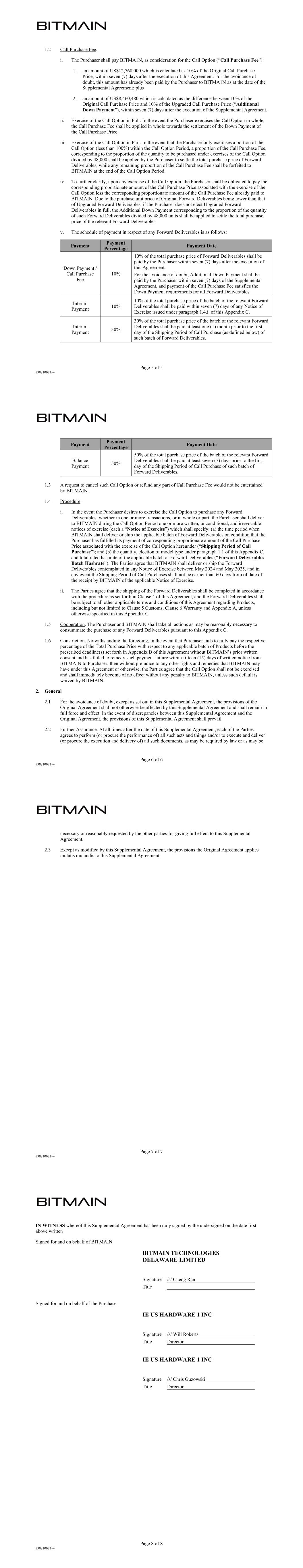 Page 5 of 5 #98810023v4 1.2 Call Purchase Fee. i. The Purchaser shall pay BITMA1N, as consideration for the Call Option (“Call Purchase Fee”): 1. an amount of US$12,768,000 which is calculated as 10% of the Original Call Purchase Price, within seven (7) days after the execution of this Agreement. For the avoidance of doubt, this amount has already been paid by the Purchaser to BITMA1N as at the date of the Supplemental Agreement; plus 2. an amount of US$8,460,480 which is calculated as the difference between 10% of the Original Call Purchase Price and 10% of the Upgraded Call Purchase Price (“Additional Down Payment”), within seven (7) days after the execution of the Supplemental Agreement. ii. Exercise of the Call Option in Full. In the event the Purchaser exercises the Call Option in whole, the Call Purchase Fee shall be applied in whole towards the settlement of the Down Payment of the Call Purchase Price. iii. Exercise of the Call Option in Part. In the event that the Purchaser only exercises a portion of the Call Option (less than 100%) within the Call Option Period, a proportion of the Call Purchase Fee, corresponding to the proportion of the quantity to be purchased under exercises of the Call Option divided by 48,000 shall be applied by the Purchaser to settle the total purchase price of Forward Deliverables, while any remaining proportion of the Call Purchase Fee shall be forfeited to BITMAIN at the end of the Call Option Period. iv. To further clarify, upon any exercise of the Call Option, the Purchaser shall be obligated to pay the corresponding proportionate amount of the Call Purchase Price associated with the exercise of the Call Option less the corresponding proportionate amount of the Call Purchase Fee already paid to BITMAIN. Due to the purchase unit price of Original Forward Deliverables being lower than that of Upgraded Forward Deliverables, if the Purchaser does not elect Upgraded Forward Deliverables in full, the Additional Down Payment corresponding to the proportion of the quantity of such Forward Deliverables divided by 48,000 units shall be applied to settle the total purchase price of the relevant Forward Deliverables. v. The schedule of payment in respect of any Forward Deliverables is as follows: Payment Payment Percentage Payment Date Down Payment / Call Purchase Fee 10% 10% of the total purchase price of Forward Deliverables shall be paid by the Purchaser within seven (7) days after the execution of this Agreement. For the avoidance of doubt, Additional Down Payment shall be paid by the Purchaser within seven (7) days of the Supplemental Agreement, and payment of the Call Purchase Fee satisfies the Down Payment requirements for all Forward Deliverables. Interim Payment 10% 10% of the total purchase price of the batch of the relevant Forward Deliverables shall be paid within seven (7) days of any Notice of Exercise issued under paragraph 1.4.i. of this Appendix C. Interim Payment 30% 30% of the total purchase price of the batch of the relevant Forward Deliverables shall be paid at least one (1) month prior to the first day of the Shipping Period of Call Purchase (as defined below) of such batch of Forward Deliverables. Page 6 of 6 #98810023v4 Payment Payment Percentage Payment Date Balance Payment 50% 50% of the total purchase price of the batch of the relevant Forward Deliverables shall be paid at least seven (7) days prior to the first day of the Shipping Period of Call Purchase of such batch of Forward Deliverables. 1.3 A request to cancel such Call Option or refund any part of Call Purchase Fee would not be entertained by BITMAIN. 1.4 Procedure. i. In the event the Purchaser desires to exercise the Call Option to purchase any Forward Deliverables, whether in one or more transactions, or in whole or part, the Purchaser shall deliver to BITMAIN during the Call Option Period one or more written, unconditional, and irrevocable notices of exercise (each a “Notice of Exercise”) which shall specify: (a) the time period when BITMAIN shall deliver or ship the applicable batch of Forward Deliverables on condition that the Purchaser has fulfilled its payment of corresponding proportionate amount of the Call Purchase Price associated with the exercise of the Call Option hereunder (“Shipping Period of Call Purchase”); and (b) the quantity, election of model type under paragraph 1.1 of this Appendix C, and total rated hashrate of the applicable batch of Forward Deliverables (“Forward Deliverables Batch Hashrate”). The Parties agree that BITMAIN shall deliver or ship the Forward Deliverables contemplated in any Notice of Exercise between May 2024 and May 2025, and in any event the Shipping Period of Call Purchases shall not be earlier than 60 days from of date of the receipt by BITMAIN of the applicable Notice of Exercise. ii. The Parties agree that the shipping of the Forward Deliverables shall be completed in accordance with the procedure as set forth in Clause 4 of this Agreement, and the Forward Deliverables shall be subject to all other applicable terms and conditions of this Agreement regarding Products, including but not limited to Clause 5 Customs, Clause 6 Warranty and Appendix A, unless otherwise specified in this Appendix C. 1.5 Cooperation. The Purchaser and BITMAIN shall take all actions as may be reasonably necessary to consummate the purchase of any Forward Deliverables pursuant to this Appendix C. 1.6 Constriction. Notwithstanding the foregoing, in the event that Purchaser fails to fully pay the respective percentage of the Total Purchase Price with respect to any applicable batch of Products before the prescribed deadline(s) set forth in Appendix B of this Agreement without BITMAIN’s prior written consent and has failed to remedy such payment failure within fifteen (15) days of written notice from BITMAIN to Purchaser, then without prejudice to any other rights and remedies that BITMAIN may have under this Agreement or otherwise, t