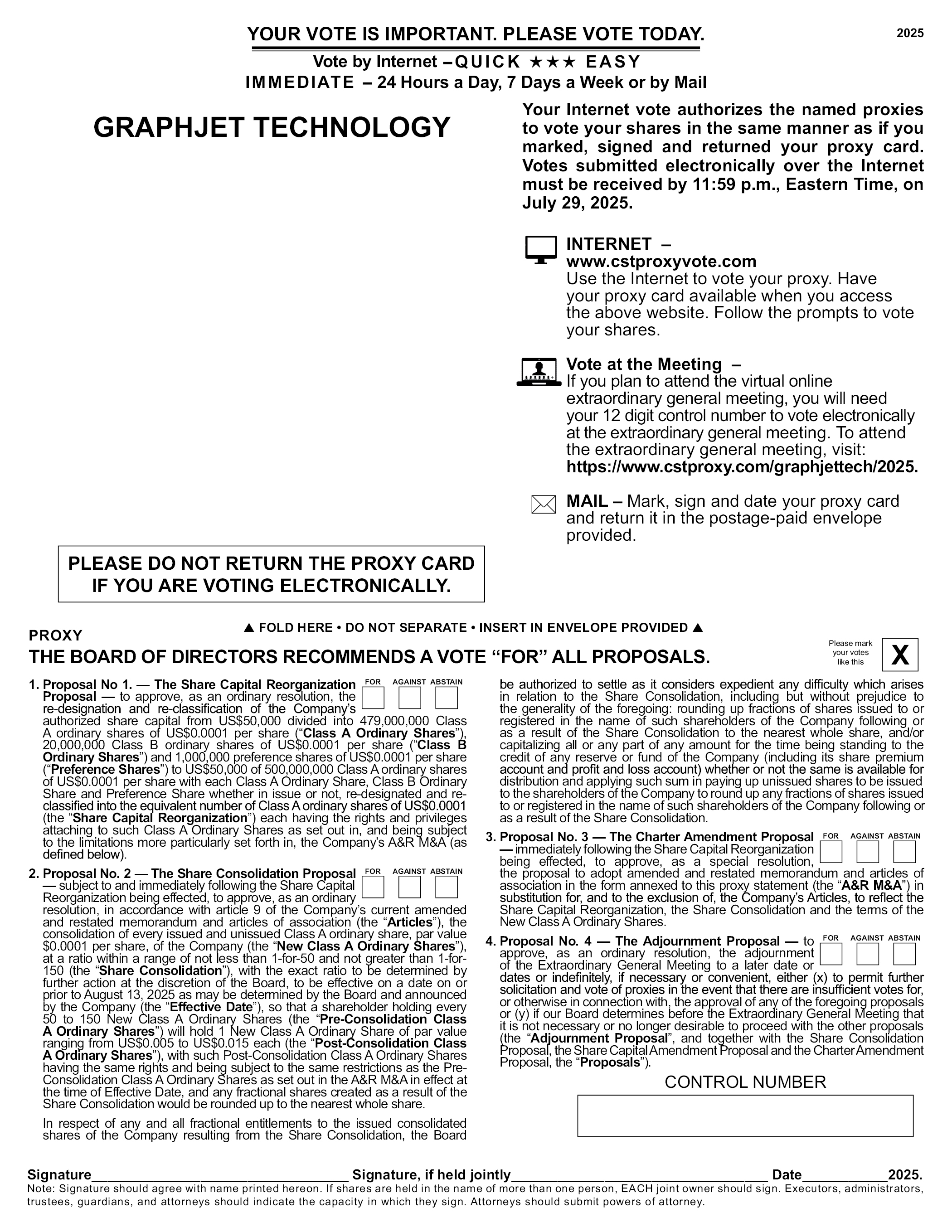 YOUR VOTE IS IMPORTANT. PLEASE VOTE TODAY. 2025Vote by Internet - QUICK EASY IMMEDIATE - 24 Hours a Day, 7 Days a Week or by Mail GRAPHJET TECHNOLOGY Your Internet vote authorizes the named proxies to vote your shares in the same manner as if you marked, signed and returned your proxy card. Votes submitted electronically over the Internet must be received by 11:59 p.m., Eastern Time, on July 29, 2025. INTERNET – www.cstproxyvote.com Use the Internet to vote your proxy. Have your proxy card available when you access the above website. Follow the prompts to vote your shares. Vote at the Meeting – If you plan to attend the virtual online extraordinary general meeting, you will need your 12 digit control number to vote electronically at the extraordinary general meeting. To attend the extraordinary general meeting, visit: https://www.cstproxy.com/graphjettech/2025. MAIL – Mark, sign and date your proxy card and return it in the postage-paid envelope provided. PLEASE DO NOT RETURN THE PROXY CARD IF YOU ARE VOTING ELECTRONICALLY. FOLD HERE DO NOT SEPARATE INSERT IN ENVELOPE PROVIDED PROXY THE BOARD OF DIRECTORS RECOMMENDS A VOTE “FOR” ALL PROPOSALS. Please mark your votes like this 1. Proposal No 1. — The Share Capital Reorganization FOR AGAINST ABSTAIN Proposal — to approve, as an ordinary resolution, the re-designation and re-classification of the Company’s authorized share capital from US$50,000 divided into 479,000,000 Class A ordinary shares of US$0.0001 per share (“Class A Ordinary Shares”), 20,000,000 Class B ordinary shares of US$0.0001 per share (“Class B Ordinary Shares”) and 1,000,000 preference shares of US$0.0001 per share (“Preference Shares”) to US$50,000 of 500,000,000 Class A ordinary shares of US$0.0001 per share with each Class A Ordinary Share, Class B Ordinary Share and Preference Share whether in issue or not, re-designated and re-classified into the equivalent number of Class A ordinary shares of US$0.0001 (the “Share Capital Reorganization”) each having the rights and privileges attaching to such Class A Ordinary Shares as set out in, and being subject to the limitations more particularly set forth in, the Company’s A&R M&A (as defined below). 2. Proposal No. 2 — The Share Consolidation Proposal FOR AGAINST ABSTAIN— subject to and immediately following the Share Capital Reorganization being effected, to approve, as an ordinary resolution, in accordance with article 9 of the Company’s current amended and restated memorandum and articles of association (the “Articles”), the consolidation of every issued and unissued Class A ordinary share, par value$0.0001 per share, of the Company (the “New Class A Ordinary Shares”), at a ratio within a range of not less than 1-for-50 and not greater than 1-for-150 (the “Share Consolidation”), with the exact ratio to be determined by further action at the discretion of the Board, to be effective on a date on or prior to August 13, 2025 as may be determined by the Board and announced by the Company (the “Effective Date”), so that a shareholder holding every 50 to 150 New Class A Ordinary Shares (the “Pre-Consolidation Class A Ordinary Shares”) will hold 1 New Class A Ordinary Share of par value ranging from US$0.005 to US$0.015 each (the “Post-Consolidation Class A Ordinary Shares”), with such Post-Consolidation Class A Ordinary Shares having the same rights and being subject to the same restrictions as the Pre-Consolidation Class A Ordinary Shares as set out in the A&R M&A in effect at the time of Effective Date, and any fractional shares created as a result of the Share Consolidation would be rounded up to the nearest whole share. In respect of any and all fractional entitlements to the issued consolidated shares of the Company resulting from the Share Consolidation, the Board be authorized to settle as it considers expedient any difficulty which arises in relation to the Share Consolidation, including but without prejudice to the generality of the foregoing: rounding up fractions of shares issued to or registered in the name of such shareholders of the Company following or as a result of the Share Consolidation to the nearest whole share, and/or capitalizing all or any part of any amount for the time being standing to the credit of any reserve or fund of the Company (including its share premium account and profit and loss account) whether or not the same is available for distribution and applying such sum in paying up unissued shares to be issued to the shareholders of the Company to round up any fractions of shares issued to or registered in the name of such shareholders of the Company following or as a result of the Share Consolidation. 3. Proposal No. 3 — The Charter Amendment Proposal FOR AGAINST ABSTAIN— immediately following the Share Capital Reorganization being effected, to approve, as a special resolution, the proposal to adopt amended and restated memorandum and articles of association in the form annexed to this proxy statement (the “A&R M&A”) in substitution for, and to the exclusion of, the Company’s Articles, to reflect the Share Capital Reorganization, the Share Consolidation and the terms of the New Class A Ordinary Shares. 4. Proposal No. 4 — The Adjournment Proposal — to FOR AGAINST ABSTAIN approve, as an ordinary resolution, the adjournment of the Extraordinary General Meeting to a later date or dates or indefinitely, if necessary or convenient, either (x) to permit further solicitation and vote of proxies in the event that there are insufficient votes for, or otherwise in connection with, the approval of any of the foregoing proposals or (y) if our Board determines before the Extraordinary General Meeting that it is not necessary or no longer desirable to proceed with the other proposals (the “Adjournment Proposal”, and together with the Share Consolidation Proposal, the Share Capital Amendment Proposal and the Charter Amendment Propos