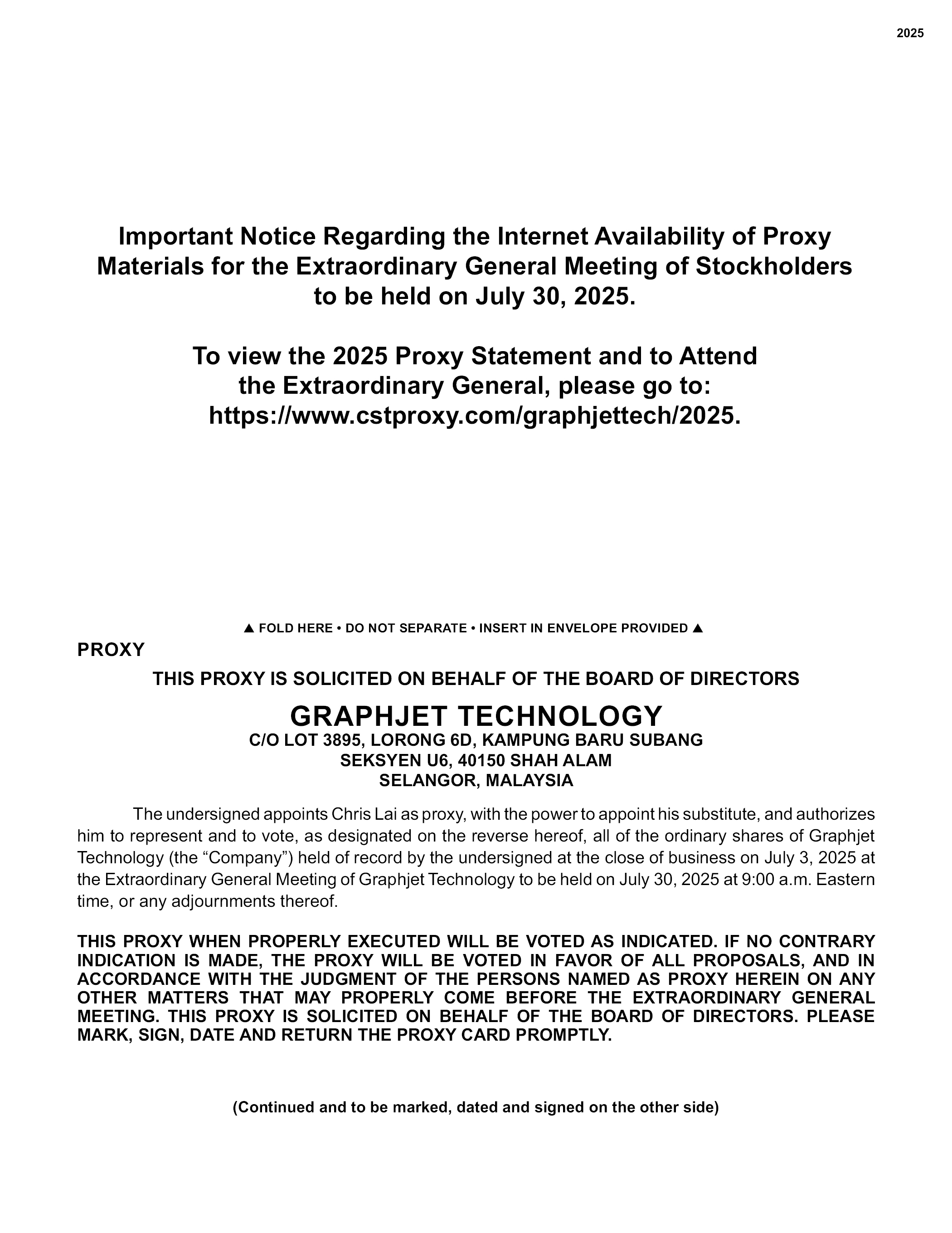 2025 Important Notice Regarding the Internet Availability of Proxy Materials for the Extraordinary General Meeting of Stockholders to be held on July 30, 2025. To view the 2025 Proxy Statement and to Attend the Extraordinary General, please go to: https://www.cstproxy.com/graphjettech/2025. FOLD HERE DO NOT SEPARATE INSERT IN ENVELOPE PROVIDED PROXY THIS PROXY IS SOLICITED ON BEHALF OF THE BOARD OF DIRECTORS GRAPHJET TECHNOLOGY C/O LOT 3895, LORONG 6D, KAMPUNG BARU SUBANG SEKSYEN U6, 40150 SHAH ALAM SELANGOR, MALAYSIA The undersigned appoints Chris Lai as proxy, with the power to appoint his substitute, and authorizes him to represent and to vote, as designated on the reverse hereof, all of the ordinary shares of Graphjet Technology (the “Company”) held of record by the undersigned at the close of business on July 3, 2025 at the Extraordinary General Meeting of Graphjet Technology to be held on July 30, 2025 at 9:00 a.m. Eastern time, or any adjournments thereof. THIS PROXY WHEN PROPERLY EXECUTED WILL BE VOTED AS INDICATED. IF NO CONTRARY INDICATION IS MADE, THE PROXY WILL BE VOTED IN FAVOR OF ALL PROPOSALS, AND IN ACCORDANCE WITH THE JUDGMENT OF THE PERSONS NAMED AS PROXY HEREIN ON ANY OTHER MATTERS THAT MAY PROPERLY COME BEFORE THE EXTRAORDINARY GENERAL MEETING. THIS PROXY IS SOLICITED ON BEHALF OF THE BOARD OF DIRECTORS. PLEASE MARK, SIGN, DATE AND RETURN THE PROXY CARD PROMPTLY (Continued and to be marked, dated and signed on the other side)