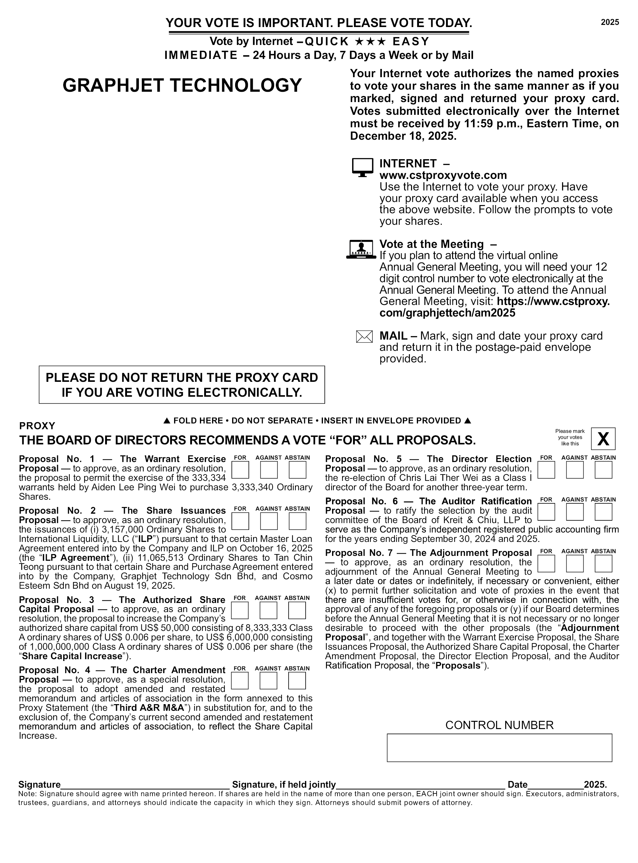 YOUR VOTE IS IMPORTANT. PLEASE VOTE TODAY. 2025 Vote by Internet – QUICK EASY IMMEDIATE - 24 Hours a Day, 7 Days a Week or by Mail GRAPHJET TECHNOLOGY Your Internet vote authorizes the named proxies to vote your shares in the same manner as if you marked, signed and returned your proxy card. Votes submitted electronically over the Internet must be received by 11:59 p.m., Eastern Time, on December 18, 2025. INTERNET – www.cstproxyvote.com Use the Internet to vote your proxy. Have your proxy card available when you access the above website. Follow the prompts to vote your shares. Vote at the Meeting – If you plan to attend the virtual online Annual General Meeting, you will need your 12 digit control number to vote electronically at the Annual General Meeting. To attend the Annual General Meeting, visit: https://www.cstproxy. com/graphjettech/am2025 MAIL – Mark, sign and date your proxy card and return it in the postage-paid envelope provided. PLEASE DO NOT RETURN THE PROXY CARD IF YOU ARE VOTING ELECTRONICALLY. FOLD HERE DO NOT SEPARATE INSERT IN ENVELOPE PROVIDED PROXY THE BOARD OF DIRECTORS RECOMMENDS A VOTE “FOR” ALL PROPOSALS. Please mark your votes like this Proposal No. 1 — The Warrant Exercise Proposal — to approve, as an ordinary resolution, the proposal to permit the exercise of the 333,334 warrants held by Aiden Lee Ping Wei to purchase 3,333,340 Ordinary Shares. FOR AGAINST ABSTAIN Proposal No. 2 — The Share Issuances Proposal — to approve, as an ordinary resolution, the issuances of (i) 3,157,000 Ordinary Shares to International Liquidity, LLC (“ILP”) pursuant to that certain Master Loan Agreement entered into by the Company and ILP on October 16, 2025 (the “ILP Agreement”), (ii) 11,065,513 Ordinary Shares to Tan Chin Teong pursuant to that certain Share and Purchase Agreement entered into by the Company, Graphjet Technology Sdn Bhd, and Cosmo Esteem Sdn Bhd on August 19, 2025. Proposal No. 3 — The Authorized Share Capital Proposal — to approve, as an ordinary resolution, the proposal to increase the Company’s authorized share capital from US$ 50,000 consisting of 8,333,333 Class A ordinary shares of US$ 0.006 per share, to US$ 6,000,000 consisting of 1,000,000,000 Class A ordinary shares of US$ 0.006 per share (the “Share Capital Increase”). Proposal No. 4 — The Charter Amendment Proposal — to approve, as a special resolution, the proposal to adopt amended and restated memorandum and articles of association in the form annexed to this Proxy Statement (the “Third A&R M&A”) in substitution for, and to the exclusion of, the Company’s current second amended and restatement memorandum and articles of association, to reflect the Share Capital Increase. Proposal No. 5 — The Director Election Proposal — to approve, as an ordinary resolution, the re-election of Chris Lai Ther Wei as a Class I director of the Board for another three-year term. Proposal No. 6 — The Auditor Ratification Proposal — to ratify the selection by the audit committee of the Board of Kreit & Chiu, LLP to serve as the Company’s independent registered public accounting firm for the years ending September 30, 2024 and 2025. Proposal No. 7 — The Adjournment Proposal — to approve, as an ordinary resolution, the adjournment of the Annual General Meeting to a later date or dates or indefinitely, if necessary or convenient, either (x) to permit further solicitation and vote of proxies in the event that there are insufficient votes for, or otherwise in connection with, the approval of any of the foregoing proposals or (y) if our Board determines before the Annual General Meeting that it is not necessary or no longer desirable to proceed with the other proposals (the “Adjournment Proposal”, and together with the Warrant Exercise Proposal, the Share Issuances Proposal, the Authorized Share Capital Proposal, the Charter Amendment Proposal, the Director Election Proposal, and the Auditor Ratification Proposal, the “Proposals”). CONTROL NUMBER Signature Signature, if held jointly Date 2025. Note: Signature should agree with name printed hereon. If shares are held in the name of more than one person, EACH joint owner should sign. Executors, administrators, trustees, guardians, and attorneys should indicate the capacity in which they sign. Attorneys should submit powers of attorney.