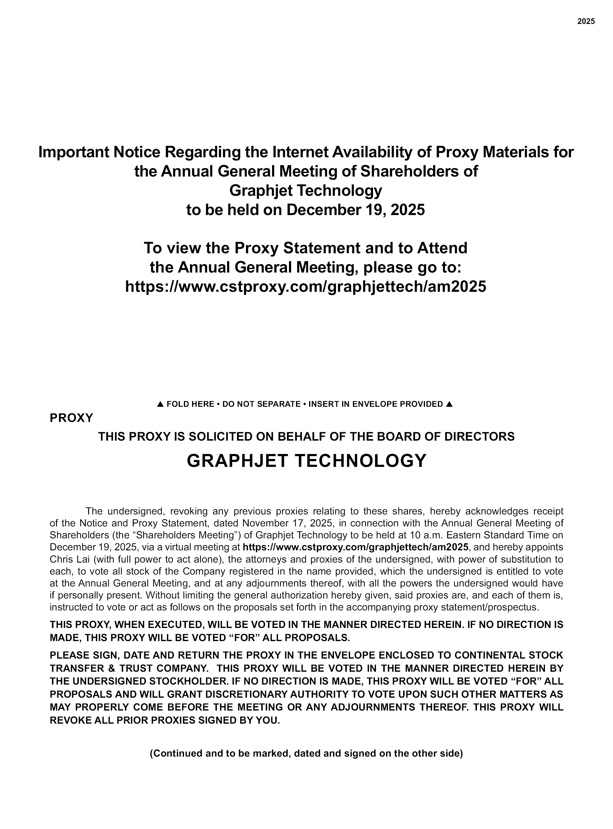 2025 Important Notice Regarding the Internet Availability of Proxy Materials for the Annual General Meeting of Shareholders of Graphjet Technology to be held on December 19, 2025 To view the Proxy Statement and to Attend the Annual General Meeting, please go to: https://www.cstproxy.com/graphjettech/am2025 FOLD HERE DO NOT SEPARATE INSERT IN ENVELOPE PROVIDED PROXY THIS PROXY IS SOLICITED ON BEHALF OF THE BOARD OF DIRECTORS GRAPHJET TECHNOLOGY The undersigned, revoking any previous proxies relating to these shares, hereby acknowledges receipt of the Notice and Proxy Statement, dated November 17, 2025, in connection with the Annual General Meeting of Shareholders (the “Shareholders Meeting”) of Graphjet Technology to be held at 10 a.m. Eastern Standard Time on December 19, 2025, via a virtual meeting at https://www.cstproxy.com/graphjettech/am2025, and hereby appoints Chris Lai (with full power to act alone), the attorneys and proxies of the undersigned, with power of substitution to each, to vote all stock of the Company registered in the name provided, which the undersigned is entitled to vote at the Annual General Meeting, and at any adjournments thereof, with all the powers the undersigned would have if personally present. Without limiting the general authorization hereby given, said proxies are, and each of them is, instructed to vote or act as follows on the proposals set forth in the accompanying proxy statement/prospectus. THIS PROXY, WHEN EXECUTED, WILL BE VOTED IN THE MANNER DIRECTED HEREIN. IF NO DIRECTION IS MADE, THIS PROXY WILL BE VOTED “FOR” ALL PROPOSALS. PLEASE SIGN, DATE AND RETURN THE PROXY IN THE ENVELOPE ENCLOSED TO CONTINENTAL STOCK TRANSFER & TRUST COMPANY. THIS PROXY WILL BE VOTED IN THE MANNER DIRECTED HEREIN BY THE UNDERSIGNED STOCKHOLDER. IF NO DIRECTION IS MADE, THIS PROXY WILL BE VOTED “FOR” ALL PROPOSALS AND WILL GRANT DISCRETIONARY AUTHORITY TO VOTE UPON SUCH OTHER MATTERS AS MAY PROPERLY COME BEFORE THE MEETING OR ANY ADJOURNMENTS THEREOF. THIS PROXY WILL REVOKE ALL PRIOR PROXIES SIGNED BY YOU. (Continued and to be marked, dated and signed on the other side)