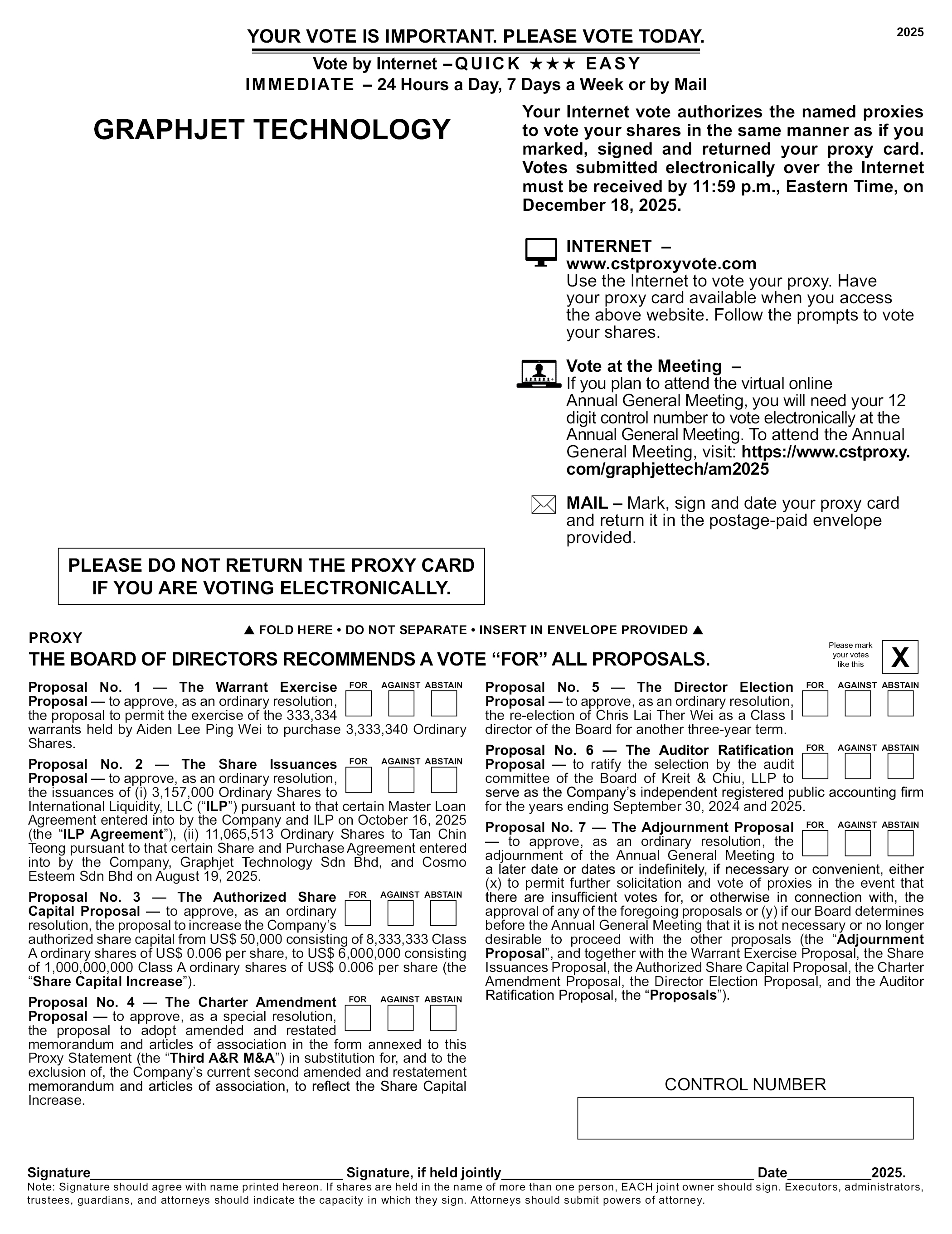 YOUR VOTE IS IMPORTANT. PLEASE VOTE TODAY. IMMEDIATE - 24 Hours a Day, 7 Days a Week or by Mail Vote by Internet – QUICK GRAPHJET TECHNOLOGY Your Internet vote authorizes the named proxies to vote your shares in the same manner as if you marked, signed and returned your proxy card. Votes submitted electronically over the Internet must be received by 11:59 p.m., Eastern Time, on December 18, 2025. INTERNET – www.cstproxyvote.com Use the Internet to vote your proxy. Have your proxy card available when you access the above website. Follow the prompts to vote your shares. Vote at the Meeting – If you plan to attend the virtual online Annual General Meeting, you will need your 12 digit control number to vote electronically at the Annual General Meeting. To attend the Annual General Meeting, visit: https://www.cstproxy. com/graphjettech/am2025 MAIL – Mark, sign and date your proxy card and return it in the postage-paid envelope provided. PLEASE DO NOT RETURN THE PROXY CARD IF YOU ARE VOTING ELECTRONICALLY. FOLD HERE • DO NOT SEPARATE • INSERT IN ENVELOPE PROVIDED PROXY THE BOARD OF DIRECTORS RECOMMENDS A VOTE “FOR” ALL PROPOSALS. Please mark your votes like this Proposal No. 1 — The Warrant Exercise Proposal — to approve, as an ordinary resolution, the proposal to permit the exercise of the 333,334 warrants held by Aiden Lee Ping Wei to purchase 3,333,340 Ordinary Shares. Proposal No. 2 — The Share Issuances Proposal — to approve, as an ordinary resolution, the issuances of (i) 3,157,000 Ordinary Shares to International Liquidity, LLC (“ILP”) pursuant to that certain Master Loan Agreement entered into by the Company and ILP on October 16, 2025 (the “ILP Agreement”), (ii) 11,065,513 Ordinary Shares to Tan Chin Teong pursuant to that certain Share and Purchase Agreement entered into by the Company, Graphjet Technology Sdn Bhd, and Cosmo Esteem Sdn Bhd on August 19, 2025. Proposal No. 3 — The Authorized Share Capital Proposal — to approve, as an ordinary resolution, the proposal to increase the Company’s authorized share capital from US$50,000 consisting of 8,333,333 Class A ordinary shares of US$0.006 per share, to US$6,000,000 consisting of 1,000,000,000 Class A ordinary shares of US$0.006 per share (the “Share Capital Increase”). Proposal No. 4 — The Charter Amendment Proposal — to approve, as a special resolution, the proposal to adopt amended and restated memorandum and articles of association in the form annexed to this Proxy Statement (the “Third A&R M&A”) in substitution for, and to the exclusion of, the Company’s current second amended and restatement memorandum and articles of association, to reflect the Share Capital Increase. Proposal No. 5 — The Director Election Proposal — to approve, as an ordinary resolution, the re-election of Chris Lai Ther Wei as a Class I director of the Board for another three-year term. Proposal No. 6 — The Auditor Ratification Proposal — to ratify the selection by the audit committee of the Board of Kreit & Chiu, LLP to serve as the Company’s independent registered public accounting firm for the years ending September 30, 2024 and 2025. Proposal No. 7 — The Adjournment Proposal — to approve, as an ordinary resolution, the adjournment of the Annual General Meeting to a later date or dates or indefinitely, if necessary or convenient, either (x) to permit further solicitation and vote of proxies in the event that there are insufficient votes for, or otherwise in connection with, the approval of any of the foregoing proposals or (y) if our Board determines before the Annual General Meeting that it is not necessary or no longer desirable to proceed with the other proposals (the “Adjournment Proposal”, and together with the Warrant Exercise Proposal, the Share Issuances Proposal, the Authorized Share Capital Proposal, the Charter Amendment Proposal, the Director Election Proposal, and the Auditor Ratification Proposal, the “Proposals”). Signature Signature, if held jointly Date 2025. Note: Signature should agree with name printed hereon. If shares are held in the name of more than one person, EACH joint owner should sign. Executors, administrators, trustees, guardians, and attorneys should indicate the capacity in which they sign. Attorneys should submit powers of attorney . CONTROL NUMBER