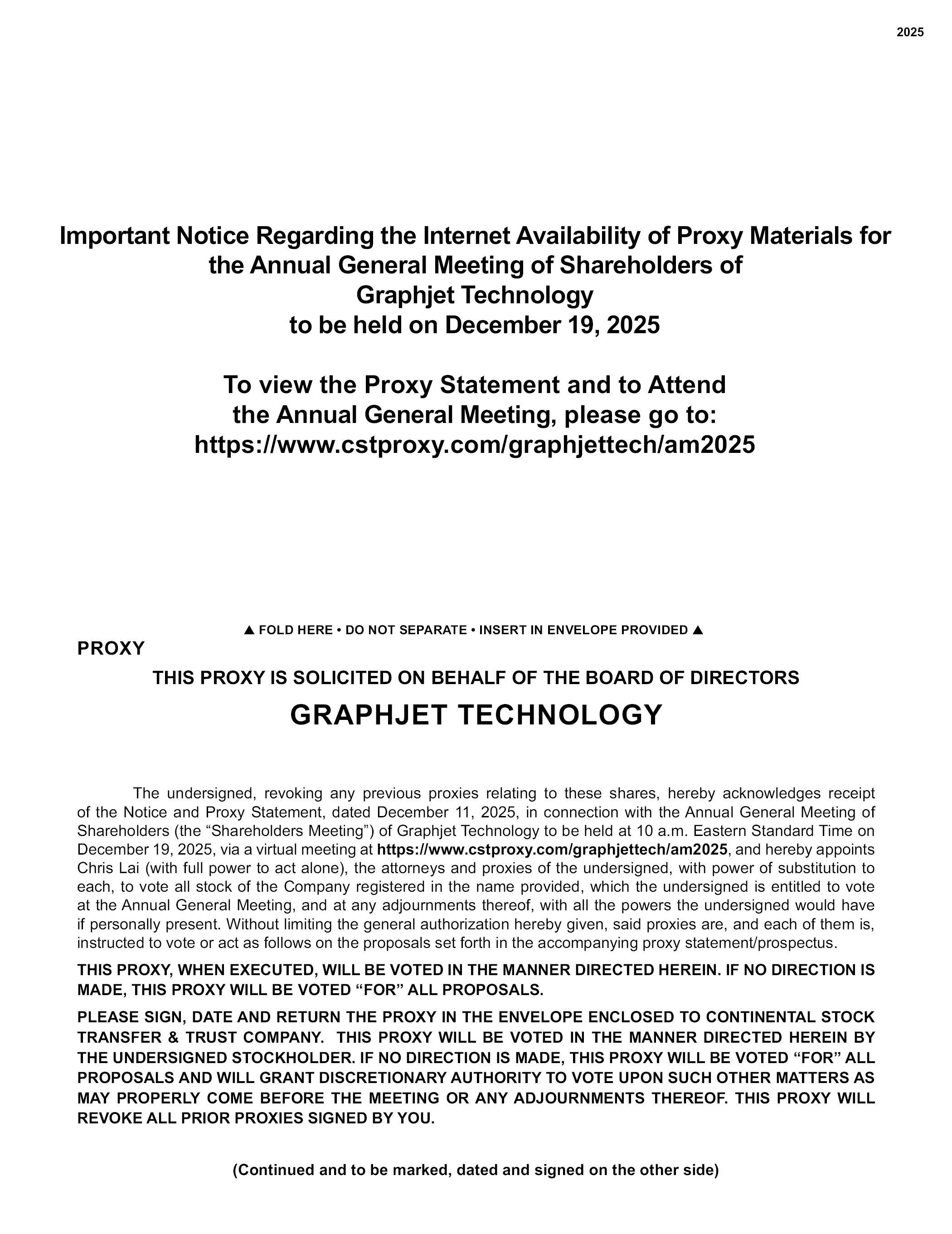 Important Notice Regarding the Internet Availability of Proxy Materials for the Annual General Meeting of Shareholders of Graphjet Technology to be held on December 19, 2025 To view the Proxy Statement and to Attend the Annual General Meeting, please go to: https://www.cstproxy.com/graphjettech/am2025 2025 Important Notice Regarding the Internet Availability of Proxy Materials for the Annual General Meeting of Shareholders of Graphjet Technology to be held on December 19, 2025 To view the Proxy Statement and to Attend the Annual General Meeting, please go to: https://www.cstproxy.com/graphjettech/am2025 FOLD HERE • DO NOT SEPARATE • INSERT IN ENVELOPE PROVIDED PROXY THIS PROXY IS SOLICITED ON BEHALF OF THE BOARD OF DIRECTORS GRAPHJET TECHNOLOGY The undersigned, revoking any previous proxies relating to these shares, hereby acknowledges receipt of the Notice and Proxy Statement, dated December 11, 2025, in connection with the Annual General Meeting of Shareholders (the “Shareholders Meeting”) of Graphjet Technology to be held at 10 a.m. Eastern Standard Time on December 19, 2025, via a virtual meeting at https://www.cstproxy.com/graphjettech/am2025, and hereby appoints Chris Lai (with full power to act alone), the attorneys and proxies of the undersigned, with power of substitution to each, to vote all stock of the Company registered in the name provided, which the undersigned is entitled to vote at the Annual General Meeting, and at any adjournments thereof, with all the powers the undersigned would have if personally present. Without limiting the general authorization hereby given, said proxies are, and each of them is, instructed to vote or act as follows on the proposals set forth in the accompanying proxy statement/prospectus. THIS PROXY, WHEN EXECUTED, WILL BE VOTED IN THE MANNER DIRECTED HEREIN. IF NO DIRECTION IS MADE, THIS PROXY WILL BE VOTED “FOR” ALL PROPOSALS. PLEASE SIGN, DATE AND RETURN THE PROXY IN THE ENVELOPE ENCLOSED TO CONTINENTAL STOCK TRANSFER & TRUST COMPANY. THIS PROXY WILL BE VOTED IN THE MANNER DIRECTED HEREIN BY THE UNDERSIGNED STOCKHOLDER. IF NO DIRECTION IS MADE, THIS PROXY WILL BE VOTED “FOR” ALL PROPOSALS AND WILL GRANT DISCRETIONARY AUTHORITY TO VOTE UPON SUCH OTHER MATTERS AS MAY PROPERLY COME BEFORE THE MEETING OR ANY ADJOURNMENTS THEREOF. THIS PROXY WILL REVOKE ALL PRIOR PROXIES SIGNED BY YOU. (Continued and to be marked, dated and signed on the other side)