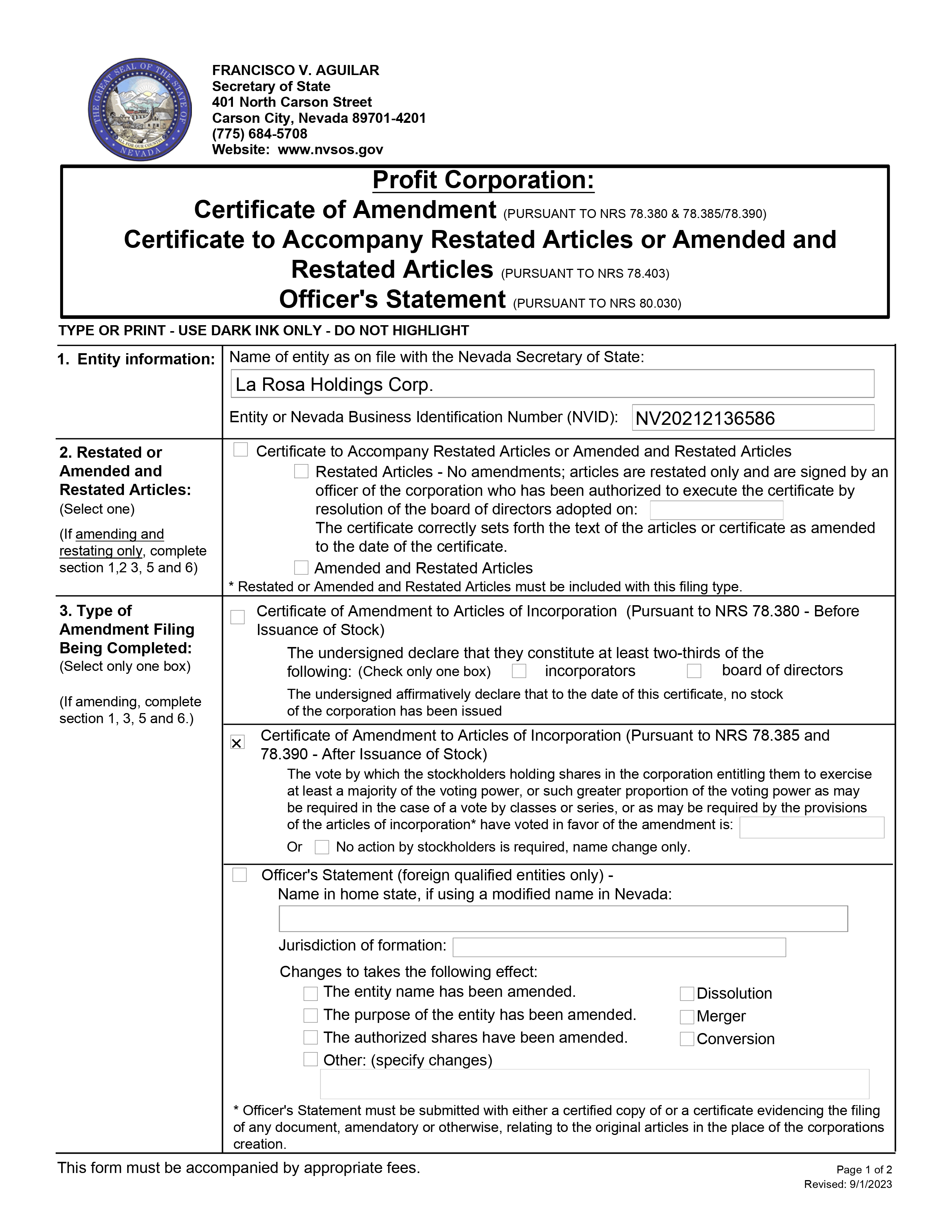 This Notice and Information Statement is being circulated to the stockholders of record of the outstanding shares of common stock, $0.0001 par value per share (the “Common Stock”), of La Rosa Holdings Corp. (the “Company”), as of the close of business on November 12, 2025 (the “Record Date”), pursuant to Rule 14c-2 promulgated under the Securities Exchange Act of 1934, as amended. The purpose of this Information Statement is to inform our stockholders of actions taken by written consent of the holders of a majority of the outstanding voting power of the Company, including Joseph La Rosa, our Chief Executive Officer, President, and Chairman of the Board of Directors of the Company (the “Board of Directors”) (holder of 2,000 shares of Series X Super Voting Preferred Stock of the Company), La Rosa Capital, LLC (holder of 255,272 shares of Common Stock), and JLR-JCCLT1 Land Trust (holder of 47,500 shares of Common Stock), in each case controlled by Mr. La Rosa, collectively holding shares representing approximately 95.65% of the outstanding voting power of the Company (the “Majority Stockholders”). This Information Statement shall be considered the notice required under Chapter 78 of the Nevada Revised Statutes (the “NRS”).