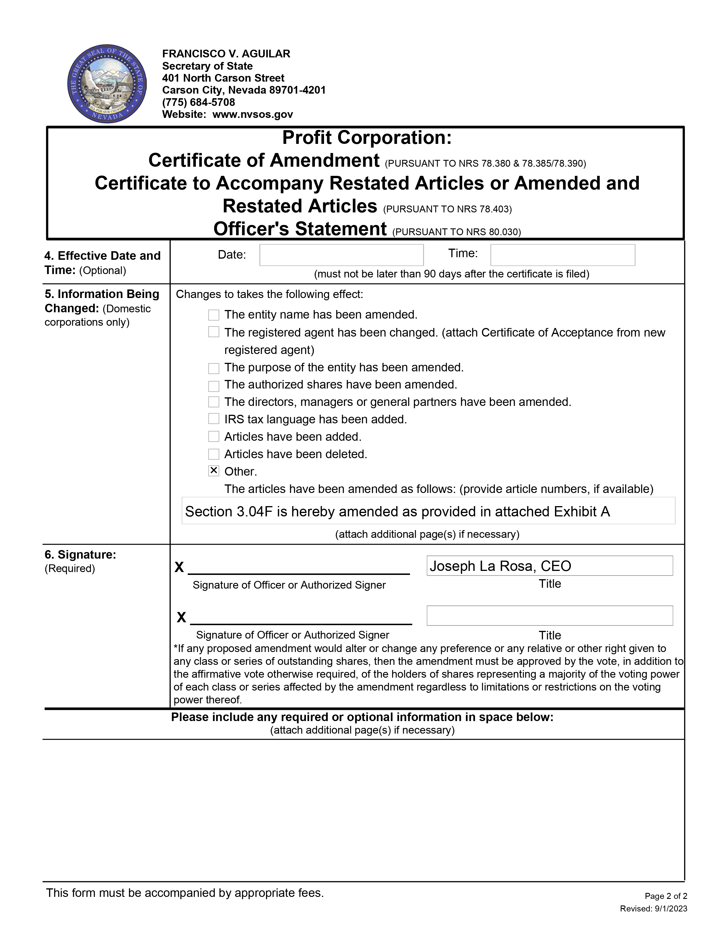 Each share of Common Stock grants one vote on each matter submitted to stockholders. Each share of Series X Preferred Stock of the Company grants 10,000 votes on each matter submitted to stockholders and votes alongside the Common Stock. As of the Record Date, 1,225,097 shares of Common Stock, totaling 1,225,097 votes, and 2,000 shares of Series X Preferred Stock of the Company, totaling 20,000,000 votes, were issued, outstanding, and eligible for action by written consent and notice of such action. The Majority Stockholders, including Joseph La Rosa, our Chief Executive Officer, President, and Chairman of the Board of Directors (holder of 2,000 shares of Series X Preferred Stock of the Company), La Rosa Capital, LLC (holder of 255,272 shares of Common Stock), and JLR-JCCLT1 Land Trust (holder of 47,500 shares of Common Stock), in each case controlled by Mr. La Rosa, collectively beneficially owned 302,772 shares of Common Stock and 2,000 shares of Series X Preferred Stock of the Company, having a total of 20,302,772 votes, constituting 95.65% of the outstanding voting power on the Record Date.