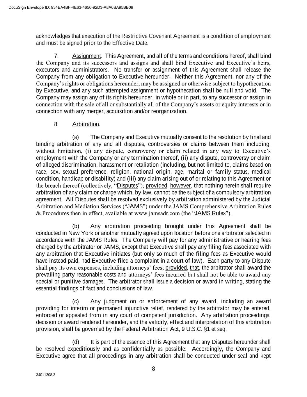 34011308.3 8 acknowledges that execution of the Restrictive Covenant Agreement is a condition of employment and must be signed prior to the Effective Date. 7. Assignment. This Agreement, and all of the terms and conditions hereof, shall bind the Company and its successors and assigns and shall bind Executive and Executive’s heirs, executors and administrators. No transfer or assignment of this Agreement shall release the Company from any obligation to Executive hereunder. Neither this Agreement, nor any of the Company’s rights or obligations hereunder, may be assigned or otherwise subject to hypothecation by Executive, and any such attempted assignment or hypothecation shall be null and void. The Company may assign any of its rights hereunder, in whole or in part, to any successor or assign in connection with the sale of all or substantially all of the Company’s assets or equity interests or in connection with any merger, acquisition and/or reorganization. 8. Arbitration. (a) The Company and Executive mutually consent to the resolution by final and binding arbitration of any and all disputes, controversies or claims between them including, without limitation, (i) any dispute, controversy or claim related in any way to Executive’s employment with the Company or any termination thereof, (ii) any dispute, controversy or claim of alleged discrimination, harassment or retaliation (including, but not limited to, claims based on race, sex, sexual preference, religion, national origin, age, marital or family status, medical condition, handicap or disability) and (iii) any claim arising out of or relating to this Agreement or the breach thereof (collectively, “Disputes”); provided, however, that nothing herein shall require arbitration of any claim or charge which, by law, cannot be the subject of a compulsory arbitration agreement. All Disputes shall be resolved exclusively by arbitration administered by the Judicial Arbitration and Mediation Services (“JAMS”) under the JAMS Comprehensive Arbitration Rules & Procedures then in effect, available at www.jamsadr.com (the “JAMS Rules”). (b) Any arbitration proceeding brought under this Agreement shall be conducted in New York or another mutually agreed upon location before one arbitrator selected in accordance with the JAMS Rules. The Company will pay for any administrative or hearing fees charged by the arbitrator or JAMS, except that Executive shall pay any filing fees associated with any arbitration that Executive initiates (but only so much of the filing fees as Executive would have instead paid, had Executive filed a complaint in a court of law). Each party to any Dispute shall pay its own expenses, including attorneys’ fees; provided, that, the arbitrator shall award the prevailing party reasonable costs and attorneys’ fees incurred but shall not be able to award any special or punitive damages. The arbitrator shall issue a decision or award in writing, stating the essential findings of fact and conclusions of law. (c) Any judgment on or enforcement of any award, including an award providing for interim or permanent injunctive relief, rendered by the arbitrator may be entered, enforced or appealed from in any court of competent jurisdiction. Any arbitration proceedings, decision or award rendered hereunder, and the validity, effect and interpretation of this arbitration provision, shall be governed by the Federal Arbitration Act, 9 U.S.C. §1 et seq. (d) It is part of the essence of this Agreement that any Disputes hereunder shall be resolved expeditiously and as confidentially as possible. Accordingly, the Company and Executive agree that all proceedings in any arbitration shall be conducted under seal and kept DocuSign Envelope ID: 934EA4BF-4E63-4656-92D3-A8A6BA95BB09