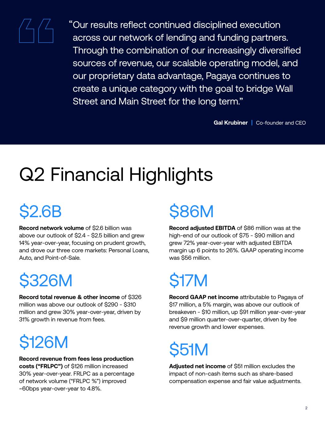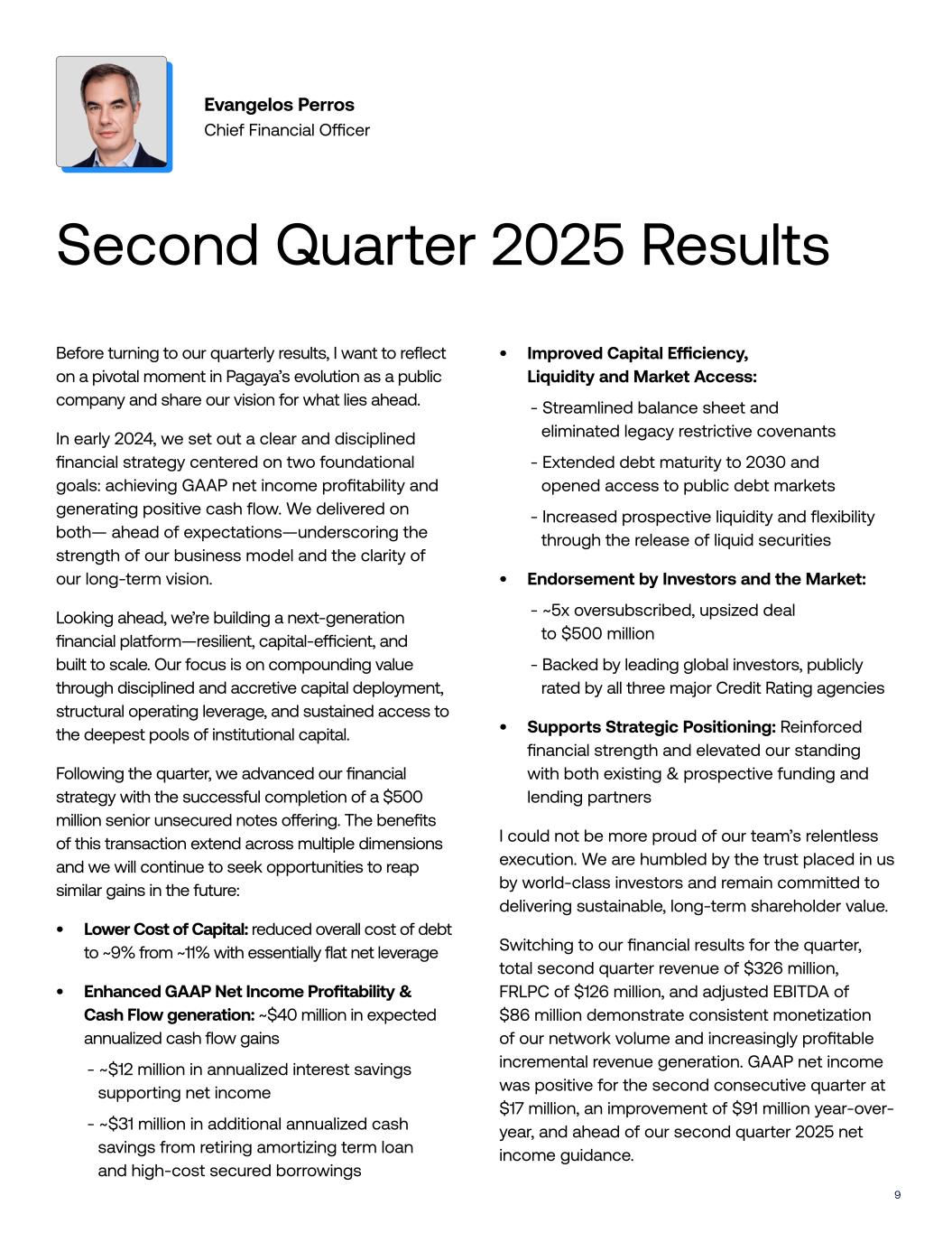 9 Evangelos Perros Chief Financial O"cer Second Quarter 2025 Results Before turning to our quarterly results, I want to reflect on a pivotal moment in Pagaya’s evolution as a public company and share our vision for what lies ahead. In early 2024, we set out a clear and disciplined financial strategy centered on two foundational goals: achieving GAAP net income profitability and generating positive cash flow. We delivered on both— ahead of expectations—underscoring the strength of our business model and the clarity of our long-term vision. Looking ahead, we’re building a next-generation financial platform—resilient, capital-e"cient, and built to scale. Our focus is on compounding value through disciplined and accretive capital deployment, structural operating leverage, and sustained access to the deepest pools of institutional capital. Following the quarter, we advanced our financial strategy with the successful completion of a $500 million senior unsecured notes o#ering. The benefits of this transaction extend across multiple dimensions and we will continue to seek opportunities to reap similar gains in the future: • Lower Cost of Capital: reduced overall cost of debt to ~9% from ~11% with essentially flat net leverage • Enhanced GAAP Net Income Profitability & Cash Flow generation: ~$40 million in expected annualized cash flow gains - ~$12 million in annualized interest savings supporting net income - ~$31 million in additional annualized cash savings from retiring amortizing term loan and high-cost secured borrowings • Improved Capital E"ciency, Liquidity and Market Access: - Streamlined balance sheet and eliminated legacy restrictive covenants - Extended debt maturity to 2030 and opened access to public debt markets - Increased prospective liquidity and flexibility through the release of liquid securities • Endorsement by Investors and the Market: - ~5x oversubscribed, upsized deal to $500 million - Backed by leading global investors, publicly rated by all three major Credit Rating agencies • Supports Strategic Positioning: Reinforced financial strength and elevated our standing with both existing & prospective funding and lending partners I could not be more proud of our team’s relentless execution. We are humbled by the trust placed in us by world-class investors and remain commi!ed to delivering sustainable, long-term shareholder value. Switching to our financial results for the quarter, total second quarter revenue of $326 million, FRLPC of $126 million, and adjusted EBITDA of $86 million demonstrate consistent monetization of our network volume and increasingly profitable incremental revenue generation. GAAP net income was positive for the second consecutive quarter at $17 million, an improvement of $91 million year-over- year, and ahead of our second quarter 2025 net income guidance.