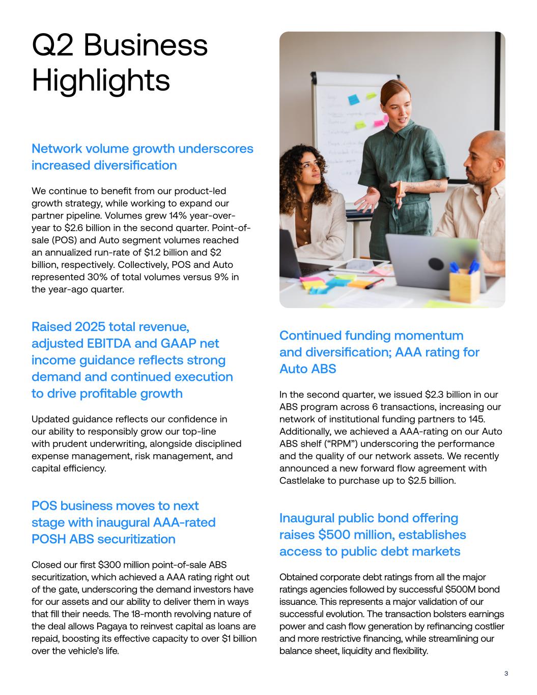 3 Network volume growth underscores increased diversification We continue to benefit from our product-led growth strategy, while working to expand our partner pipeline. Volumes grew 14% year-over- year to $2.6 billion in the second quarter. Point-of- sale (POS) and Auto segment volumes reached an annualized run-rate of $1.2 billion and $2 billion, respectively. Collectively, POS and Auto represented 30% of total volumes versus 9% in the year-ago quarter. Raised 2025 total revenue, adjusted EBITDA and GAAP net income guidance reflects strong demand and continued execution to drive profitable growth Updated guidance reflects our confidence in our ability to responsibly grow our top-line with prudent underwriting, alongside disciplined expense management, risk management, and capital e"ciency. POS business moves to next stage with inaugural AAA-rated POSH ABS securitization Closed our first $300 million point-of-sale ABS securitization, which achieved a AAA rating right out of the gate, underscoring the demand investors have for our assets and our ability to deliver them in ways that fill their needs. The 18-month revolving nature of the deal allows Pagaya to reinvest capital as loans are repaid, boosting its e#ective capacity to over $1 billion over the vehicle’s life. Continued funding momentum and diversification; AAA rating for Auto ABS In the second quarter, we issued $2.3 billion in our ABS program across 6 transactions, increasing our network of institutional funding partners to 145. Additionally, we achieved a AAA-rating on our Auto ABS shelf (“RPM”) underscoring the performance and the quality of our network assets. We recently announced a new forward flow agreement with Castlelake to purchase up to $2.5 billion. Inaugural public bond o!ering raises $500 million, establishes access to public debt markets Obtained corporate debt ratings from all the major ratings agencies followed by successful $500M bond issuance. This represents a major validation of our successful evolution. The transaction bolsters earnings power and cash flow generation by refinancing costlier and more restrictive financing, while streamlining our balance sheet, liquidity and flexibility. Q2 Business Highlights