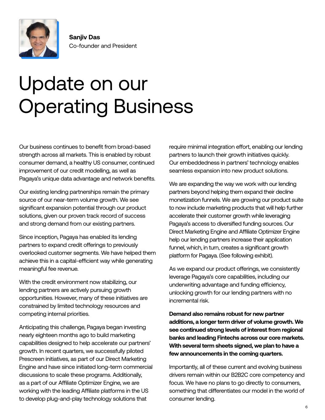 Our business continues to benefit from broad-based strength across all markets. This is enabled by robust consumer demand, a healthy US consumer, continued improvement of our credit modelling, as well as Pagaya’s unique data advantage and network benefits. Our existing lending partnerships remain the primary source of our near-term volume growth. We see significant expansion potential through our product solutions, given our proven track record of success and strong demand from our existing partners. Since inception, Pagaya has enabled its lending partners to expand credit o#erings to previously overlooked customer segments. We have helped them achieve this in a capital-e"cient way while generating meaningful fee revenue. With the credit environment now stabilizing, our lending partners are actively pursuing growth opportunities. However, many of these initiatives are constrained by limited technology resources and competing internal priorities. Anticipating this challenge, Pagaya began investing nearly eighteen months ago to build marketing capabilities designed to help accelerate our partners’ growth. In recent quarters, we successfully piloted Prescreen initiatives, as part of our Direct Marketing Engine and have since initiated long-term commercial discussions to scale these programs. Additionally, as a part of our A"liate Optimizer Engine, we are working with the leading A"liate platforms in the US to develop plug-and-play technology solutions that Sanjiv Das Co-founder and President 6 Update on our Operating Business require minimal integration e#ort, enabling our lending partners to launch their growth initiatives quickly. Our embeddedness in partners’ technology enables seamless expansion into new product solutions. We are expanding the way we work with our lending partners beyond helping them expand their decline monetization funnels. We are growing our product suite to now include marketing products that will help further accelerate their customer growth while leveraging Pagaya’s access to diversified funding sources. Our Direct Marketing Engine and A"liate Optimizer Engine help our lending partners increase their application funnel, which, in turn, creates a significant growth platform for Pagaya. (See following exhibit). As we expand our product o#erings, we consistently leverage Pagaya’s core capabilities, including our underwriting advantage and funding e"ciency, unlocking growth for our lending partners with no incremental risk. Demand also remains robust for new partner additions, a longer term driver of volume growth. We see continued strong levels of interest from regional banks and leading Fintechs across our core markets. With several term sheets signed, we plan to have a few announcements in the coming quarters. Importantly, all of these current and evolving business drivers remain within our B2B2C core competency and focus. We have no plans to go directly to consumers, something that di#erentiates our model in the world of consumer lending.