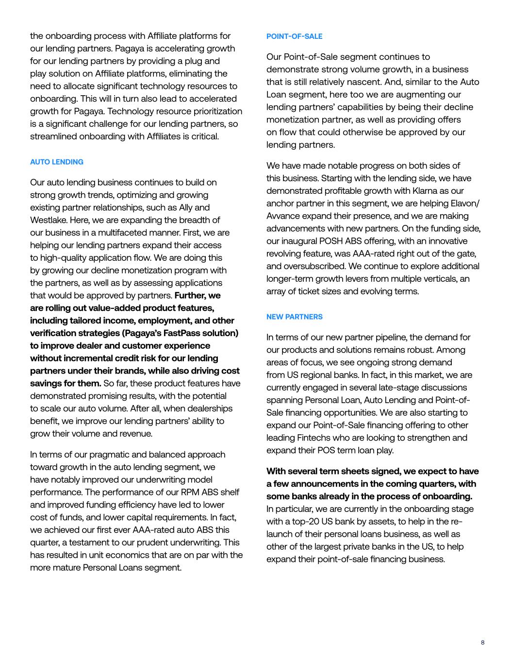 8 the onboarding process with A"liate platforms for our lending partners. Pagaya is accelerating growth for our lending partners by providing a plug and play solution on A"liate platforms, eliminating the need to allocate significant technology resources to onboarding. This will in turn also lead to accelerated growth for Pagaya. Technology resource prioritization is a significant challenge for our lending partners, so streamlined onboarding with A"liates is critical. AUTO LENDING Our auto lending business continues to build on strong growth trends, optimizing and growing existing partner relationships, such as Ally and Westlake. Here, we are expanding the breadth of our business in a multifaceted manner. First, we are helping our lending partners expand their access to high-quality application flow. We are doing this by growing our decline monetization program with the partners, as well as by assessing applications that would be approved by partners. Further, we are rolling out value-added product features, including tailored income, employment, and other verification strategies (Pagaya’s FastPass solution) to improve dealer and customer experience without incremental credit risk for our lending partners under their brands, while also driving cost savings for them. So far, these product features have demonstrated promising results, with the potential to scale our auto volume. A$er all, when dealerships benefit, we improve our lending partners’ ability to grow their volume and revenue. In terms of our pragmatic and balanced approach toward growth in the auto lending segment, we have notably improved our underwriting model performance. The performance of our RPM ABS shelf and improved funding e"ciency have led to lower cost of funds, and lower capital requirements. In fact, we achieved our first ever AAA-rated auto ABS this quarter, a testament to our prudent underwriting. This has resulted in unit economics that are on par with the more mature Personal Loans segment. POINT-OF-SALE Our Point-of-Sale segment continues to demonstrate strong volume growth, in a business that is still relatively nascent. And, similar to the Auto Loan segment, here too we are augmenting our lending partners’ capabilities by being their decline monetization partner, as well as providing o#ers on flow that could otherwise be approved by our lending partners. We have made notable progress on both sides of this business. Starting with the lending side, we have demonstrated profitable growth with Klarna as our anchor partner in this segment, we are helping Elavon/ Avvance expand their presence, and we are making advancements with new partners. On the funding side, our inaugural POSH ABS o#ering, with an innovative revolving feature, was AAA-rated right out of the gate, and oversubscribed. We continue to explore additional longer-term growth levers from multiple verticals, an array of ticket sizes and evolving terms. NEW PARTNERS In terms of our new partner pipeline, the demand for our products and solutions remains robust. Among areas of focus, we see ongoing strong demand from US regional banks. In fact, in this market, we are currently engaged in several late-stage discussions spanning Personal Loan, Auto Lending and Point-of- Sale financing opportunities. We are also starting to expand our Point-of-Sale financing o#ering to other leading Fintechs who are looking to strengthen and expand their POS term loan play. With several term sheets signed, we expect to have a few announcements in the coming quarters, with some banks already in the process of onboarding. In particular, we are currently in the onboarding stage with a top-20 US bank by assets, to help in the re- launch of their personal loans business, as well as other of the largest private banks in the US, to help expand their point-of-sale financing business.
