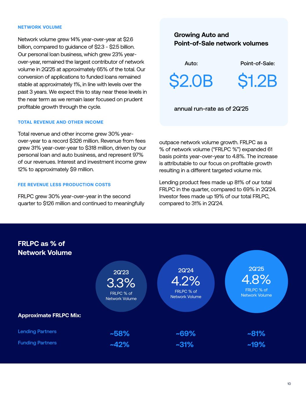 10 NETWORK VOLUME Network volume grew 14% year-over-year at $2.6 billion, compared to guidance of $2.3 - $2.5 billion. Our personal loan business, which grew 23% year- over-year, remained the largest contributor of network volume in 2Q’25 at approximately 65% of the total. Our conversion of applications to funded loans remained stable at approximately 1%, in line with levels over the past 3 years. We expect this to stay near these levels in the near term as we remain laser focused on prudent profitable growth through the cycle. TOTAL REVENUE AND OTHER INCOME Total revenue and other income grew 30% year- over-year to a record $326 million. Revenue from fees grew 31% year-over-year to $318 million, driven by our personal loan and auto business, and represent 97% of our revenues. Interest and investment income grew 12% to approximately $9 million. FEE REVENUE LESS PRODUCTION COSTS FRLPC grew 30% year-over-year in the second quarter to $126 million and continued to meaningfully Approximate FRLPC Mix: Lending Partners Funding Partners 2Q’23 3.3% FRLPC % of Network Volume ~58% ~42% ~69% ~31% ~81% ~19% 2Q’25 4.8% FRLPC % of Network Volume 2Q’24 4.2% FRLPC % of Network Volume outpace network volume growth. FRLPC as a % of network volume (“FRLPC %”) expanded 61 basis points year-over-year to 4.8%. The increase is a!ributable to our focus on profitable growth resulting in a di#erent targeted volume mix. Lending product fees made up 81% of our total FRLPC in the quarter, compared to 69% in 2Q’24. Investor fees made up 19% of our total FRLPC, compared to 31% in 2Q’24. Point-of-Sale: Growing Auto and Point-of-Sale network volumes annual run-rate as of 2Q’25 $2.0B $1.2B FRLPC as % of Network Volume Auto: