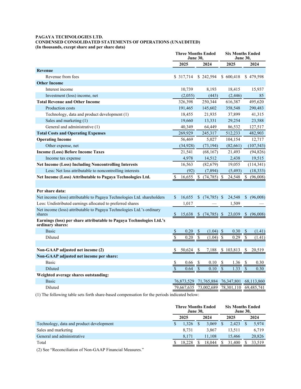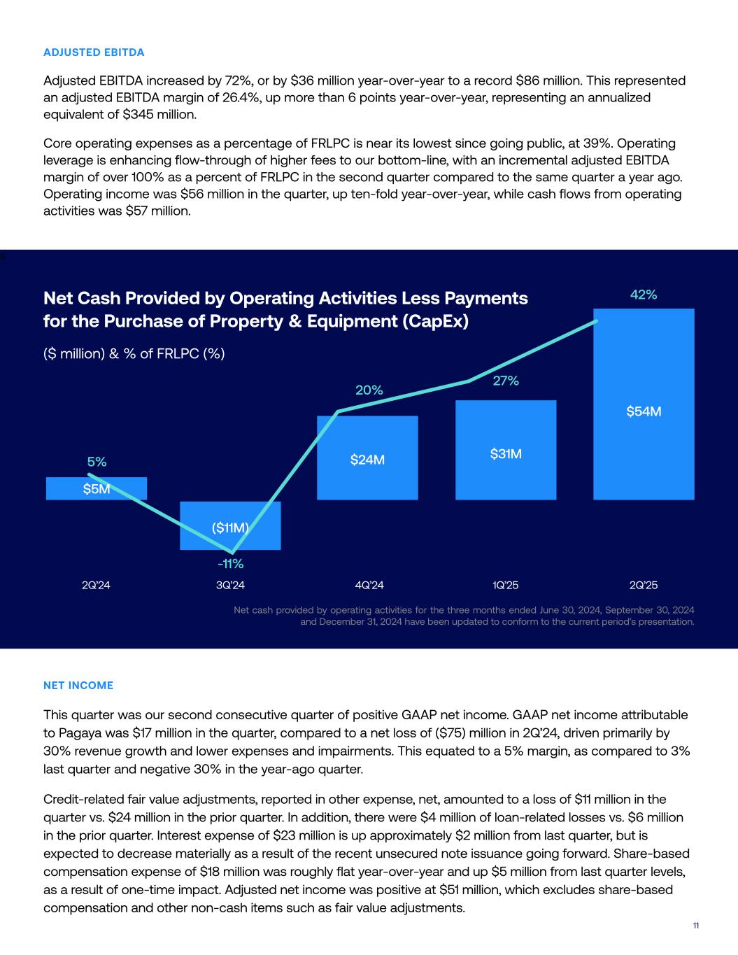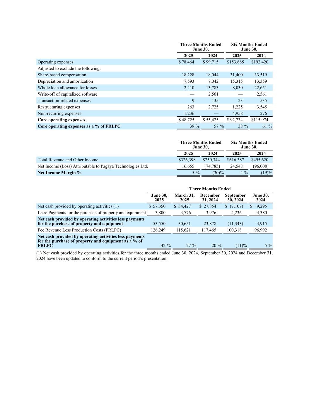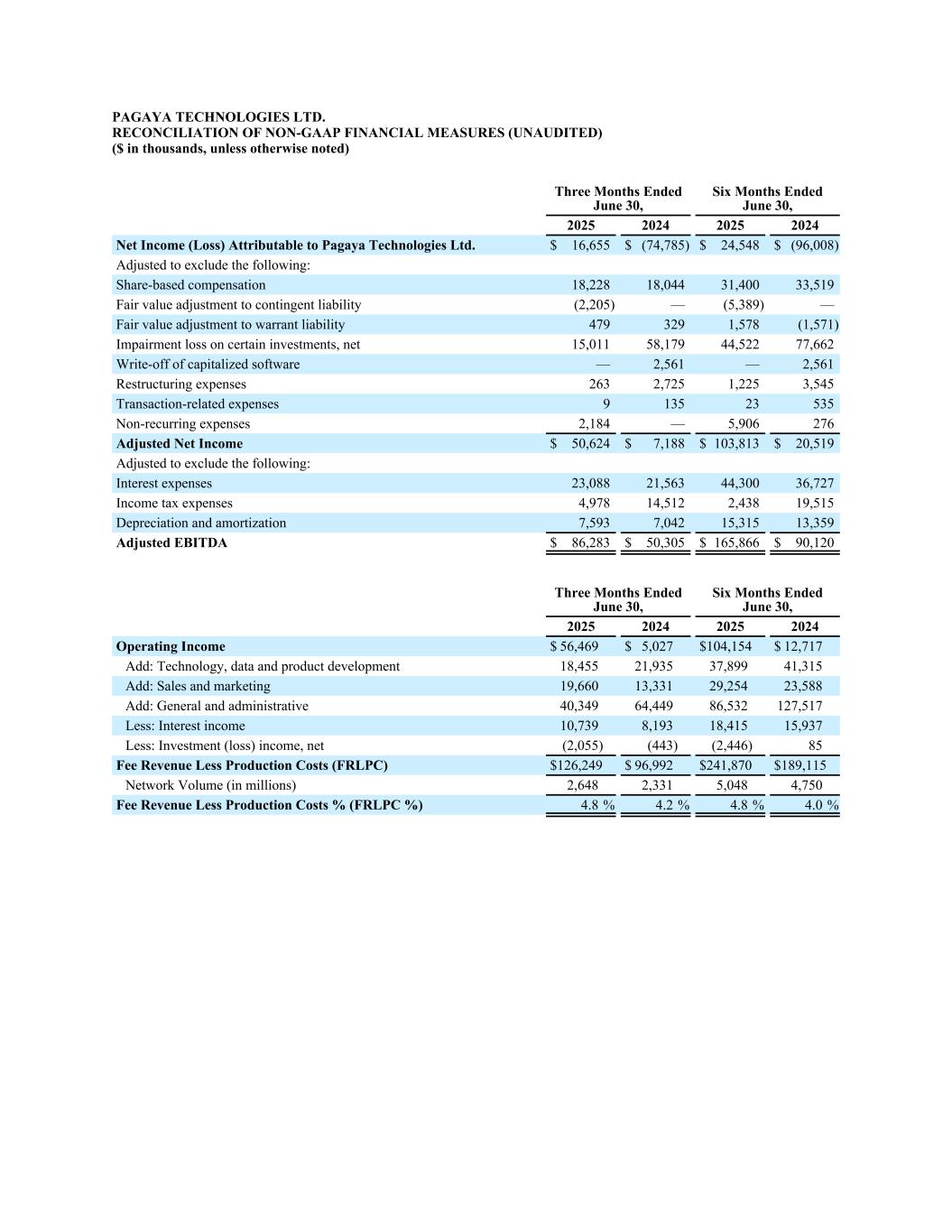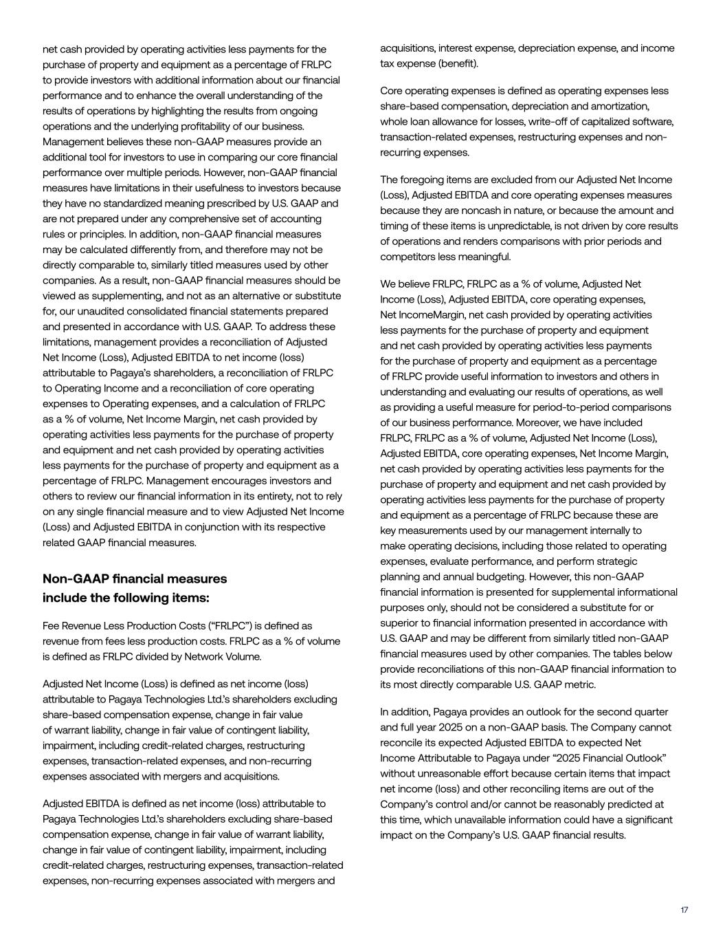 17 net cash provided by operating activities less payments for the purchase of property and equipment as a percentage of FRLPC to provide investors with additional information about our financial performance and to enhance the overall understanding of the results of operations by highlighting the results from ongoing operations and the underlying profitability of our business. Management believes these non-GAAP measures provide an additional tool for investors to use in comparing our core financial performance over multiple periods. However, non-GAAP financial measures have limitations in their usefulness to investors because they have no standardized meaning prescribed by U.S. GAAP and are not prepared under any comprehensive set of accounting rules or principles. In addition, non-GAAP financial measures may be calculated di#erently from, and therefore may not be directly comparable to, similarly titled measures used by other companies. As a result, non-GAAP financial measures should be viewed as supplementing, and not as an alternative or substitute for, our unaudited consolidated financial statements prepared and presented in accordance with U.S. GAAP. To address these limitations, management provides a reconciliation of Adjusted Net Income (Loss), Adjusted EBITDA to net income (loss) a!ributable to Pagaya’s shareholders, a reconciliation of FRLPC to Operating Income and a reconciliation of core operating expenses to Operating expenses, and a calculation of FRLPC as a % of volume, Net Income Margin, net cash provided by operating activities less payments for the purchase of property and equipment and net cash provided by operating activities less payments for the purchase of property and equipment as a percentage of FRLPC. Management encourages investors and others to review our financial information in its entirety, not to rely on any single financial measure and to view Adjusted Net Income (Loss) and Adjusted EBITDA in conjunction with its respective related GAAP financial measures. Non-GAAP financial measures include the following items: Fee Revenue Less Production Costs (“FRLPC”) is defined as revenue from fees less production costs. FRLPC as a % of volume is defined as FRLPC divided by Network Volume. Adjusted Net Income (Loss) is defined as net income (loss) a!ributable to Pagaya Technologies Ltd.’s shareholders excluding share-based compensation expense, change in fair value of warrant liability, change in fair value of contingent liability, impairment, including credit-related charges, restructuring expenses, transaction-related expenses, and non-recurring expenses associated with mergers and acquisitions. Adjusted EBITDA is defined as net income (loss) a!ributable to Pagaya Technologies Ltd.’s shareholders excluding share-based compensation expense, change in fair value of warrant liability, change in fair value of contingent liability, impairment, including credit-related charges, restructuring expenses, transaction-related expenses, non-recurring expenses associated with mergers and acquisitions, interest expense, depreciation expense, and income tax expense (benefit). Core operating expenses is defined as operating expenses less share-based compensation, depreciation and amortization, whole loan allowance for losses, write-o# of capitalized so$ware, transaction-related expenses, restructuring expenses and non- recurring expenses. The foregoing items are excluded from our Adjusted Net Income (Loss), Adjusted EBITDA and core operating expenses measures because they are noncash in nature, or because the amount and timing of these items is unpredictable, is not driven by core results of operations and renders comparisons with prior periods and competitors less meaningful. We believe FRLPC, FRLPC as a % of volume, Adjusted Net Income (Loss), Adjusted EBITDA, core operating expenses, Net IncomeMargin, net cash provided by operating activities less payments for the purchase of property and equipment and net cash provided by operating activities less payments for the purchase of property and equipment as a percentage of FRLPC provide useful information to investors and others in understanding and evaluating our results of operations, as well as providing a useful measure for period-to-period comparisons of our business performance. Moreover, we have included FRLPC, FRLPC as a % of volume, Adjusted Net Income (Loss), Adjusted EBITDA, core operating expenses, Net Income Margin, net cash provided by operating activities less payments for the purchase of property and equipment and net cash provided by operating activities less payments for the purchase of property and equipment as a percentage of FRLPC because these are key measurements used by our management internally to make operating decisions, including those related to operating expenses, evaluate performance, and perform strategic planning and annual budgeting. However, this non-GAAP financial information is presented for supplemental informational purposes only, should not be considered a substitute for or superior to financial information presented in accordance with U.S. GAAP and may be di#erent from similarly titled non-GAAP financial measures used by other companies. The tables below provide reconciliations of this non-GAAP financial information to its most directly comparable U.S. GAAP metric. In addition, Pagaya provides an outlook for the second quarter and full year 2025 on a non-GAAP basis. The Company cannot reconcile its expected Adjusted EBITDA to expected Net Income A!ributable to Pagaya under “2025 Financial Outlook” without unreasonable e#ort because certain items that impact net income (loss) and other reconciling items are out of the Company’s control and/or cannot be reasonably predicted at this time, which unavailable information could have a significant impact on the Company’s U.S. GAAP financial results.