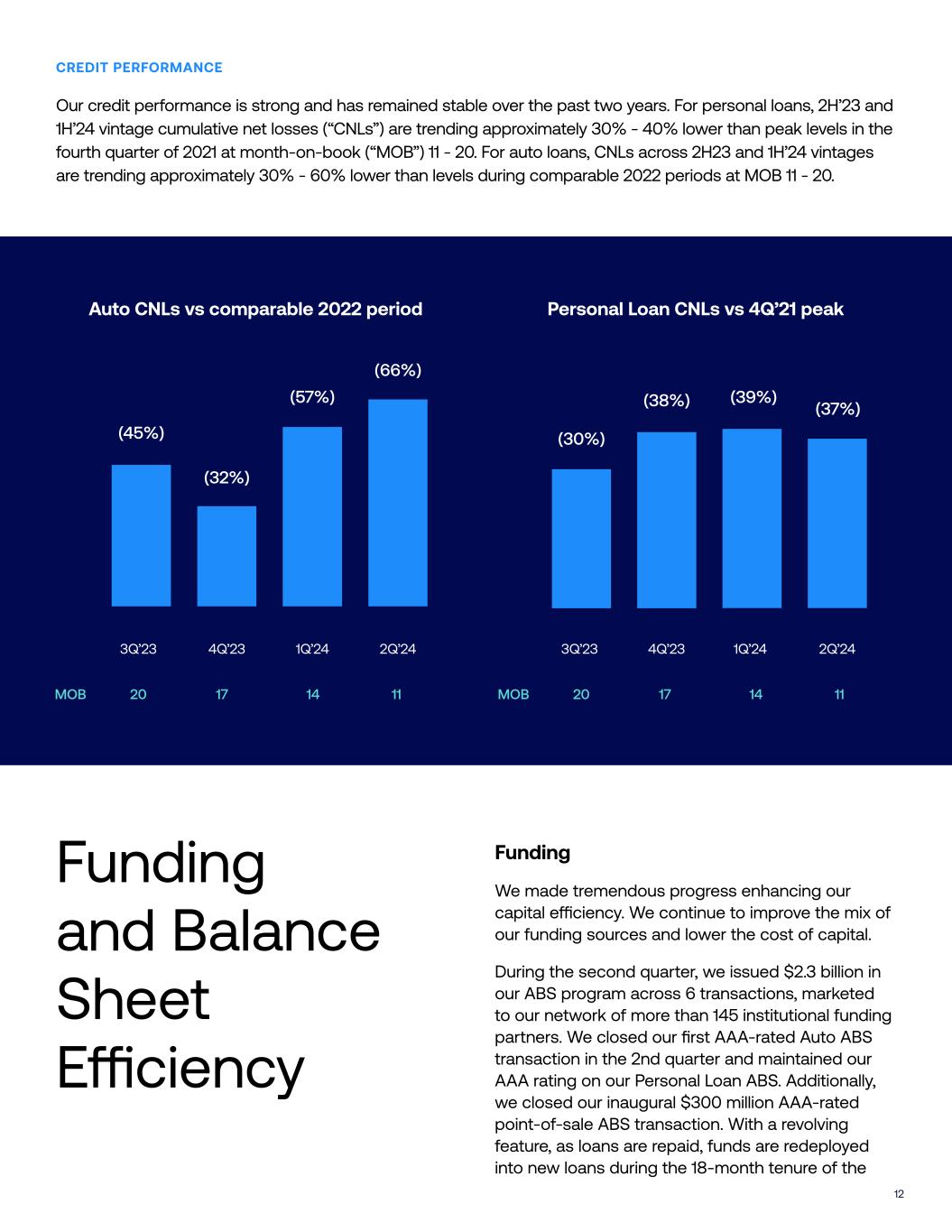 12 CREDIT PERFORMANCE Our credit performance is strong and has remained stable over the past two years. For personal loans, 2H’23 and 1H’24 vintage cumulative net losses (“CNLs”) are trending approximately 30% - 40% lower than peak levels in the fourth quarter of 2021 at month-on-book (“MOB”) 11 - 20. For auto loans, CNLs across 2H23 and 1H’24 vintages are trending approximately 30% - 60% lower than levels during comparable 2022 periods at MOB 11 - 20. Funding and Balance Sheet E"ciency Funding We made tremendous progress enhancing our capital e"ciency. We continue to improve the mix of our funding sources and lower the cost of capital. During the second quarter, we issued $2.3 billion in our ABS program across 6 transactions, marketed to our network of more than 145 institutional funding partners. We closed our first AAA-rated Auto ABS transaction in the 2nd quarter and maintained our AAA rating on our Personal Loan ABS. Additionally, we closed our inaugural $300 million AAA-rated point-of-sale ABS transaction. With a revolving feature, as loans are repaid, funds are redeployed into new loans during the 18-month tenure of the Auto CNLs vs comparable 2022 period Personal Loan CNLs vs 4Q’21 peak 3Q’23 (45%) (32%) 4Q’23 (57%) 1Q’24 (66%) 2Q’24 3Q’23 4Q’23 1Q’24 2Q’24 (30%) (38%) (39%) (37%) MOB 20 17 14 11 MOB 20 17 14 11