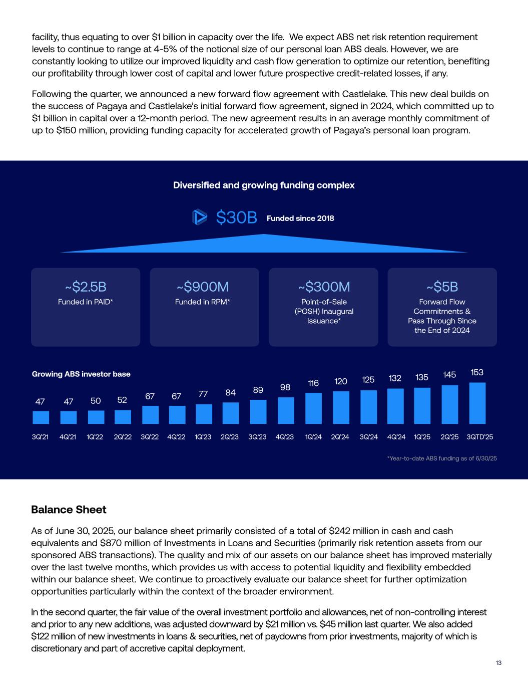 13 Funded since 2018$30B ~$2.5B Funded in PAID* ~$900M Funded in RPM* ~$300M Point-of-Sale (POSH) Inaugural Issuance* ~$5B Forward Flow Commitments & Pass Through Since the End of 2024 3Q’21 4Q’21 1Q’22 2Q’22 3Q’22 4Q’22 1Q’23 2Q’23 3Q’23 4Q’23 1Q’24 2Q’24 3Q’24 4Q’24 1Q’25 2Q’25 3QTD’25 47 47 50 52 67 67 77 84 89 98 116 120 125 132 135 145 153 Diversified and growing funding complex Growing ABS investor base *Year-to-date ABS funding as of 6/30/25 facility, thus equating to over $1 billion in capacity over the life. We expect ABS net risk retention requirement levels to continue to range at 4-5% of the notional size of our personal loan ABS deals. However, we are constantly looking to utilize our improved liquidity and cash flow generation to optimize our retention, benefiting our profitability through lower cost of capital and lower future prospective credit-related losses, if any. Following the quarter, we announced a new forward flow agreement with Castlelake. This new deal builds on the success of Pagaya and Castlelake’s initial forward flow agreement, signed in 2024, which commi!ed up to $1 billion in capital over a 12-month period. The new agreement results in an average monthly commitment of up to $150 million, providing funding capacity for accelerated growth of Pagaya’s personal loan program. Balance Sheet As of June 30, 2025, our balance sheet primarily consisted of a total of $242 million in cash and cash equivalents and $870 million of Investments in Loans and Securities (primarily risk retention assets from our sponsored ABS transactions). The quality and mix of our assets on our balance sheet has improved materially over the last twelve months, which provides us with access to potential liquidity and flexibility embedded within our balance sheet. We continue to proactively evaluate our balance sheet for further optimization opportunities particularly within the context of the broader environment. In the second quarter, the fair value of the overall investment portfolio and allowances, net of non-controlling interest and prior to any new additions, was adjusted downward by $21 million vs. $45 million last quarter. We also added $122 million of new investments in loans & securities, net of paydowns from prior investments, majority of which is discretionary and part of accretive capital deployment.