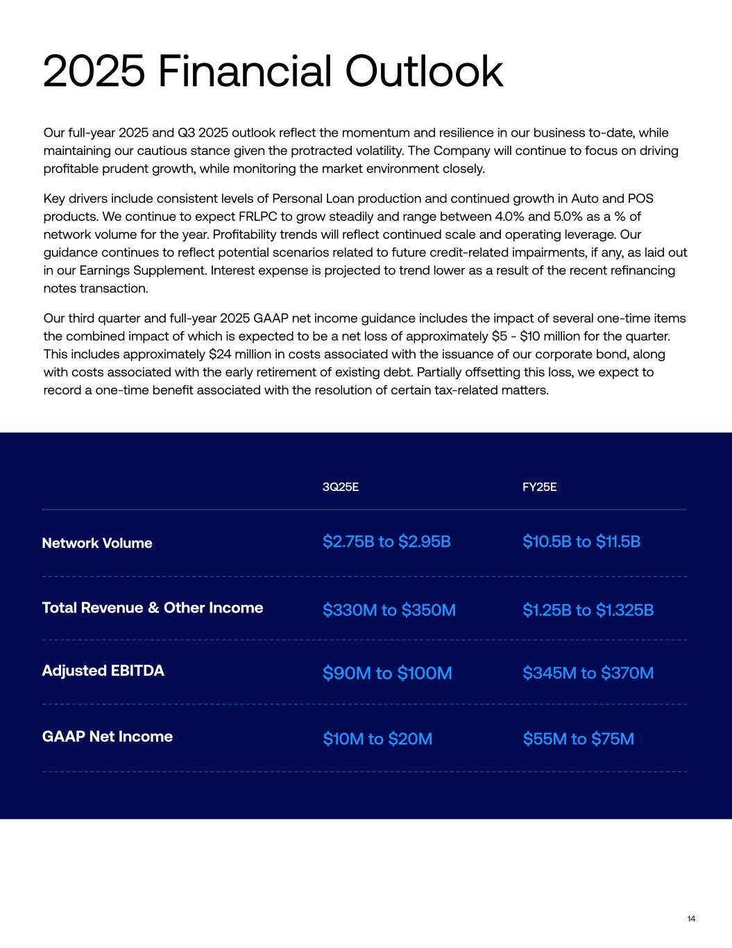 14 3Q25E FY25E Network Volume $10.5B to $11.5B$2.75B to $2.95B Total Revenue & Other Income $1.25B to $1.325B$330M to $350M Adjusted EBITDA $345M to $370M$90M to $100M GAAP Net Income $55M to $75M$10M to $20M Our full-year 2025 and Q3 2025 outlook reflect the momentum and resilience in our business to-date, while maintaining our cautious stance given the protracted volatility. The Company will continue to focus on driving profitable prudent growth, while monitoring the market environment closely. Key drivers include consistent levels of Personal Loan production and continued growth in Auto and POS products. We continue to expect FRLPC to grow steadily and range between 4.0% and 5.0% as a % of network volume for the year. Profitability trends will reflect continued scale and operating leverage. Our guidance continues to reflect potential scenarios related to future credit-related impairments, if any, as laid out in our Earnings Supplement. Interest expense is projected to trend lower as a result of the recent refinancing notes transaction. Our third quarter and full-year 2025 GAAP net income guidance includes the impact of several one-time items the combined impact of which is expected to be a net loss of approximately $5 - $10 million for the quarter. This includes approximately $24 million in costs associated with the issuance of our corporate bond, along with costs associated with the early retirement of existing debt. Partially o#se!ing this loss, we expect to record a one-time benefit associated with the resolution of certain tax-related ma!ers. 2025 Financial Outlook