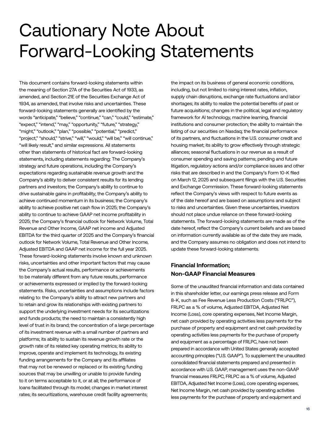 16 This document contains forward-looking statements within the meaning of Section 27A of the Securities Act of 1933, as amended, and Section 21E of the Securities Exchange Act of 1934, as amended, that involve risks and uncertainties. These forward-looking statements generally are identified by the words “anticipate,” “believe,” “continue,” “can,” “could,” “estimate,” “expect,” “intend,” “may,” “opportunity,” “future,” “strategy,” “might,” “outlook,” “plan,” “possible,” “potential,” “predict,” “project,” “should,” “strive,” “will,” “would,” “will be,” “will continue,” “will likely result,” and similar expressions. All statements other than statements of historical fact are forward-looking statements, including statements regarding: The Company’s strategy and future operations, including the Company’s expectations regarding sustainable revenue growth and the Company’s ability to deliver consistent results for its lending partners and investors; the Company’s ability to continue to drive sustainable gains in profitability; the Company’s ability to achieve continued momentum in its business; the Company’s ability to achieve positive net cash flow in 2025; the Company’s ability to continue to achieve GAAP net income profitability in 2025; the Company’s financial outlook for Network Volume, Total Revenue and Other Income, GAAP net income and Adjusted EBITDA for the third quarter of 2025 and the Company’s financial outlook for Network Volume, Total Revenue and Other Income, Adjusted EBITDA and GAAP net income for the full year 2025. These forward-looking statements involve known and unknown risks, uncertainties and other important factors that may cause the Company’s actual results, performance or achievements to be materially di#erent from any future results, performance or achievements expressed or implied by the forward-looking statements. Risks, uncertainties and assumptions include factors relating to: the Company’s ability to a!ract new partners and to retain and grow its relationships with existing partners to support the underlying investment needs for its securitizations and funds products; the need to maintain a consistently high level of trust in its brand; the concentration of a large percentage of its investment revenue with a small number of partners and platforms; its ability to sustain its revenue growth rate or the growth rate of its related key operating metrics; its ability to improve, operate and implement its technology, its existing funding arrangements for the Company and its a"liates that may not be renewed or replaced or its existing funding sources that may be unwilling or unable to provide funding to it on terms acceptable to it, or at all; the performance of loans facilitated through its model; changes in market interest rates; its securitizations, warehouse credit facility agreements; the impact on its business of general economic conditions, including, but not limited to rising interest rates, inflation, supply chain disruptions, exchange rate fluctuations and labor shortages; its ability to realize the potential benefits of past or future acquisitions; changes in the political, legal and regulatory framework for AI technology, machine learning, financial institutions and consumer protection; the ability to maintain the listing of our securities on Nasdaq; the financial performance of its partners, and fluctuations in the U.S. consumer credit and housing market; its ability to grow e#ectively through strategic alliances; seasonal fluctuations in our revenue as a result of consumer spending and saving pa!erns; pending and future litigation, regulatory actions and/or compliance issues and other risks that are described in and the Company’s Form 10-K filed on March 12, 2025 and subsequent filings with the U.S. Securities and Exchange Commission. These forward-looking statements reflect the Company’s views with respect to future events as of the date hereof and are based on assumptions and subject to risks and uncertainties. Given these uncertainties, investors should not place undue reliance on these forward-looking statements. The forward-looking statements are made as of the date hereof, reflect the Company’s current beliefs and are based on information currently available as of the date they are made, and the Company assumes no obligation and does not intend to update these forward-looking statements. Financial Information; Non-GAAP Financial Measures Some of the unaudited financial information and data contained in this shareholder le!er, our earnings press release and Form 8-K, such as Fee Revenue Less Production Costs (“FRLPC”), FRLPC as a % of volume, Adjusted EBITDA, Adjusted Net Income (Loss), core operating expenses, Net Income Margin, net cash provided by operating activities less payments for the purchase of property and equipment and net cash provided by operating activities less payments for the purchase of property and equipment as a percentage of FRLPC, have not been prepared in accordance with United States generally accepted accounting principles (“U.S. GAAP”). To supplement the unaudited consolidated financial statements prepared and presented in accordance with U.S. GAAP, management uses the non-GAAP financial measures FRLPC, FRLPC as a % of volume, Adjusted EBITDA, Adjusted Net Income (Loss), core operating expenses, Net Income Margin, net cash provided by operating activities less payments for the purchase of property and equipment and Cautionary Note About Forward-Looking Statements