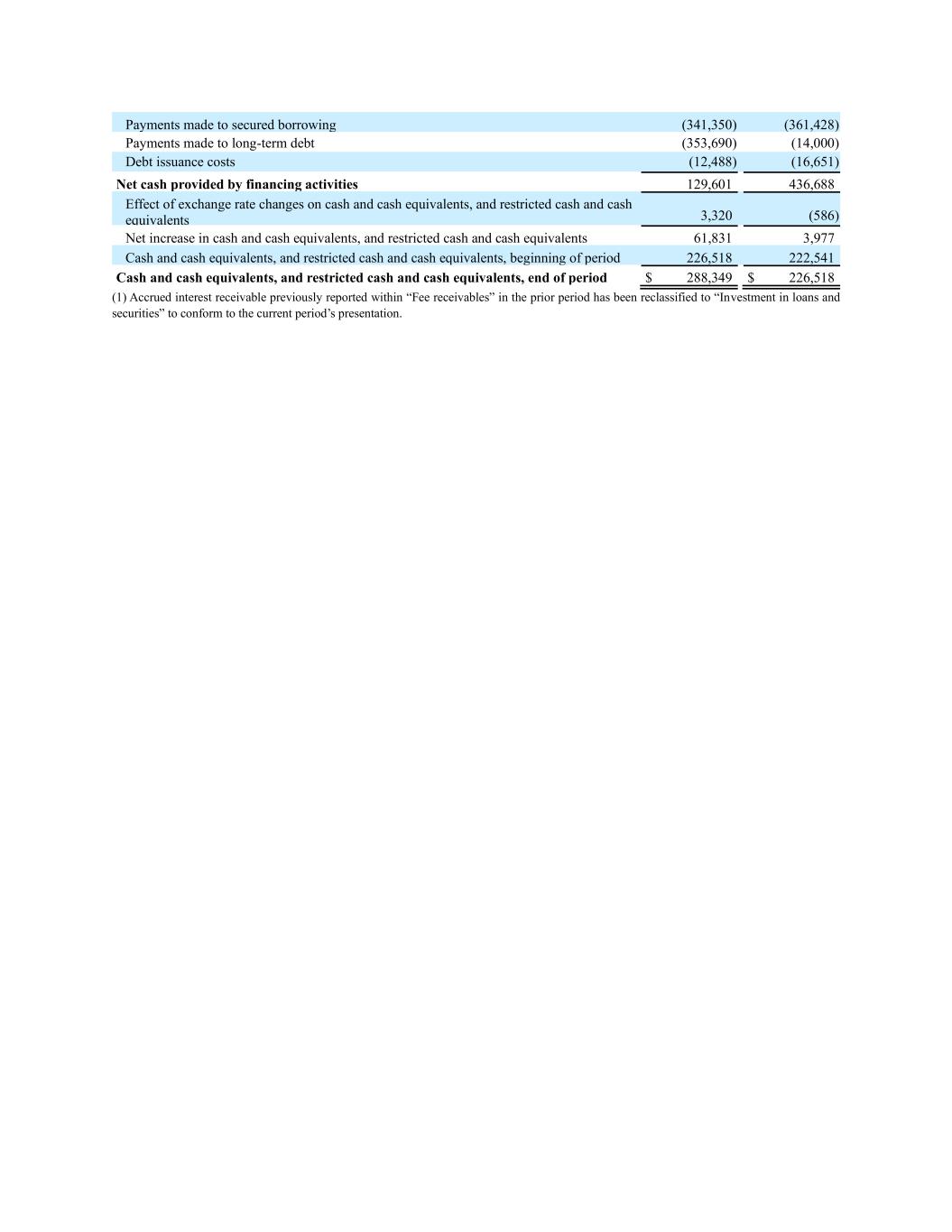 Payments made to secured borrowing (341,350) (361,428) Payments made to long-term debt (353,690) (14,000) Debt issuance costs (12,488) (16,651) Net cash provided by financing activities 129,601 436,688 Effect of exchange rate changes on cash and cash equivalents, and restricted cash and cash equivalents 3,320 (586) Net increase in cash and cash equivalents, and restricted cash and cash equivalents 61,831 3,977 Cash and cash equivalents, and restricted cash and cash equivalents, beginning of period 226,518 222,541 Cash and cash equivalents, and restricted cash and cash equivalents, end of period $ 288,349 $ 226,518 (1) Accrued interest receivable previously reported within “Fee receivables” in the prior period has been reclassified to “Investment in loans and securities” to conform to the current period’s presentation.