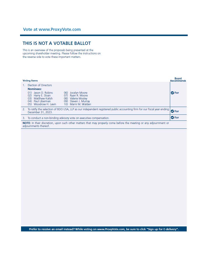 Vote at www . P r oxyVote . com THI S I S N O T A VO TABLEBALL OT Th i s i s an overviev.t of thep r oposa l s be i ng p r esented at t h e upc o m i n g sha reh old e r m ee t i ng. P l ease fo ll ow t he i n structio ns on t h e r everses i de to vote these i mportant m atte rs . Voung Items B o a ro Recommends 1. E l ect i on of Di r ectors N om i nees : 1) Jaso n D . Robins 06 ) Joc ely n Moo r e 2) H arry E . S l oan 07 ) Ryan R . M00<e 3) Ma tth ew Ka l ish 08) Va l e ri e Mo sl ey 4) Pa u l Libe r man 09 ) Steven J . M u rray 0 5) Wood r ow H. L ev i n 10 ) Ma rn i M . Wa ld e n O For 2 . T o r at i fy the se l ect i on of B O O USA, UP as ou r i ndependen r teg i ste r ed pu b l i c acc ount i n g f i rm fo r ou r fi sca l yea r end i ng December 3 1 , 2023 . 0 For 3 . T o cond uct a n on - b i nd i ng a dviso ry vote on execut ive co mpensat i on. 0 For NOTE : I n the i r d i scretion, u p on such other m a tt ers tha t m ay p r o pe rty come bef ore the meeting o r an y ad jo u rnment o r ad j ournments thereof . Prefer to recerve an ema1l 1 nste a d1 While voting on www.ProxyVote . com, be sure to click '"Sign up for E - delrvery".