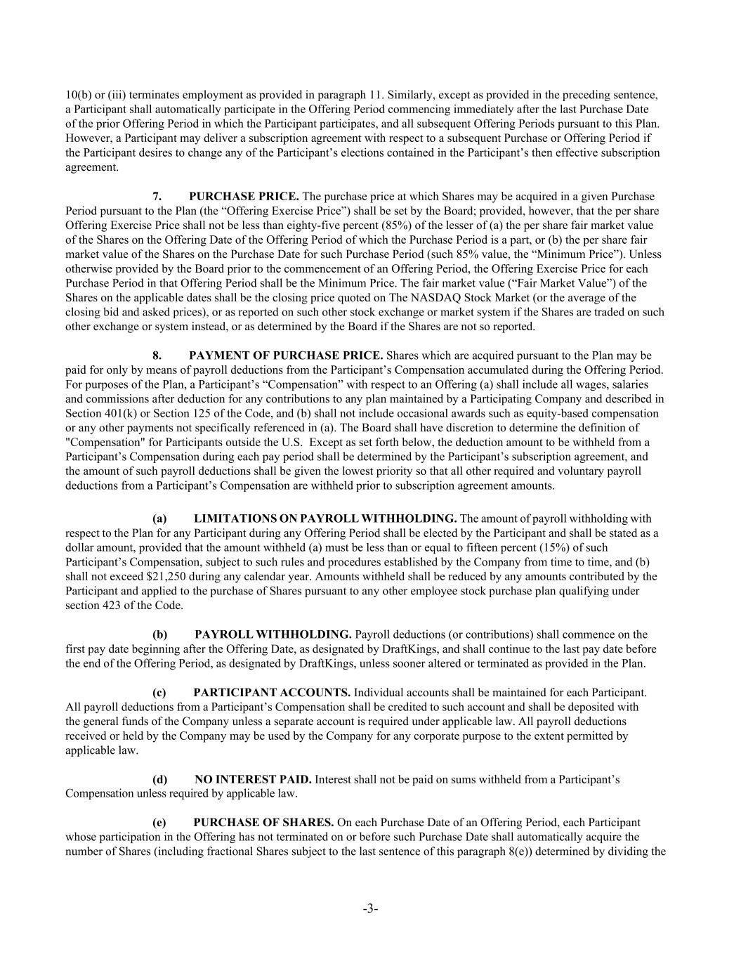 -3- 10(b) or (iii) terminates employment as provided in paragraph 11. Similarly, except as provided in the preceding sentence, a Participant shall automatically participate in the Offering Period commencing immediately after the last Purchase Date of the prior Offering Period in which the Participant participates, and all subsequent Offering Periods pursuant to this Plan. However, a Participant may deliver a subscription agreement with respect to a subsequent Purchase or Offering Period if the Participant desires to change any of the Participant’s elections contained in the Participant’s then effective subscription agreement. 7. PURCHASE PRICE. The purchase price at which Shares may be acquired in a given Purchase Period pursuant to the Plan (the “Offering Exercise Price”) shall be set by the Board; provided, however, that the per share Offering Exercise Price shall not be less than eighty-five percent (85%) of the lesser of (a) the per share fair market value of the Shares on the Offering Date of the Offering Period of which the Purchase Period is a part, or (b) the per share fair market value of the Shares on the Purchase Date for such Purchase Period (such 85% value, the “Minimum Price”). Unless otherwise provided by the Board prior to the commencement of an Offering Period, the Offering Exercise Price for each Purchase Period in that Offering Period shall be the Minimum Price. The fair market value (“Fair Market Value”) of the Shares on the applicable dates shall be the closing price quoted on The NASDAQ Stock Market (or the average of the closing bid and asked prices), or as reported on such other stock exchange or market system if the Shares are traded on such other exchange or system instead, or as determined by the Board if the Shares are not so reported. 8. PAYMENT OF PURCHASE PRICE. Shares which are acquired pursuant to the Plan may be paid for only by means of payroll deductions from the Participant’s Compensation accumulated during the Offering Period. For purposes of the Plan, a Participant’s “Compensation” with respect to an Offering (a) shall include all wages, salaries and commissions after deduction for any contributions to any plan maintained by a Participating Company and described in Section 401(k) or Section 125 of the Code, and (b) shall not include occasional awards such as equity-based compensation or any other payments not specifically referenced in (a). The Board shall have discretion to determine the definition of "Compensation" for Participants outside the U.S. Except as set forth below, the deduction amount to be withheld from a Participant’s Compensation during each pay period shall be determined by the Participant’s subscription agreement, and the amount of such payroll deductions shall be given the lowest priority so that all other required and voluntary payroll deductions from a Participant’s Compensation are withheld prior to subscription agreement amounts. (a) LIMITATIONS ON PAYROLL WITHHOLDING. The amount of payroll withholding with respect to the Plan for any Participant during any Offering Period shall be elected by the Participant and shall be stated as a dollar amount, provided that the amount withheld (a) must be less than or equal to fifteen percent (15%) of such Participant’s Compensation, subject to such rules and procedures established by the Company from time to time, and (b) shall not exceed $21,250 during any calendar year. Amounts withheld shall be reduced by any amounts contributed by the Participant and applied to the purchase of Shares pursuant to any other employee stock purchase plan qualifying under section 423 of the Code. (b) PAYROLL WITHHOLDING. Payroll deductions (or contributions) shall commence on the first pay date beginning after the Offering Date, as designated by DraftKings, and shall continue to the last pay date before the end of the Offering Period, as designated by DraftKings, unless sooner altered or terminated as provided in the Plan. (c) PARTICIPANT ACCOUNTS. Individual accounts shall be maintained for each Participant. All payroll deductions from a Participant’s Compensation shall be credited to such account and shall be deposited with the general funds of the Company unless a separate account is required under applicable law. All payroll deductions received or held by the Company may be used by the Company for any corporate purpose to the extent permitted by applicable law. (d) NO INTEREST PAID. Interest shall not be paid on sums withheld from a Participant’s Compensation unless required by applicable law. (e) PURCHASE OF SHARES. On each Purchase Date of an Offering Period, each Participant whose participation in the Offering has not terminated on or before such Purchase Date shall automatically acquire the number of Shares (including fractional Shares subject to the last sentence of this paragraph 8(e)) determined by dividing the