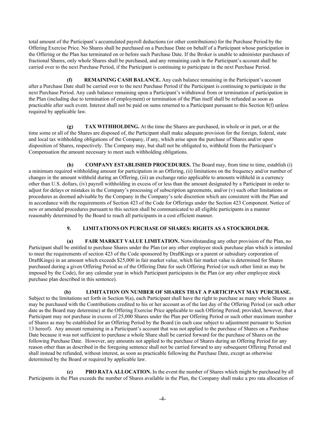 -4- total amount of the Participant’s accumulated payroll deductions (or other contributions) for the Purchase Period by the Offering Exercise Price. No Shares shall be purchased on a Purchase Date on behalf of a Participant whose participation in the Offering or the Plan has terminated on or before such Purchase Date. If the Broker is unable to administer purchases of fractional Shares, only whole Shares shall be purchased, and any remaining cash in the Participant’s account shall be carried over to the next Purchase Period, if the Participant is continuing to participate in the next Purchase Period. (f) REMAINING CASH BALANCE. Any cash balance remaining in the Participant’s account after a Purchase Date shall be carried over to the next Purchase Period if the Participant is continuing to participate in the next Purchase Period. Any cash balance remaining upon a Participant’s withdrawal from or termination of participation in the Plan (including due to termination of employment) or termination of the Plan itself shall be refunded as soon as practicable after such event. Interest shall not be paid on sums returned to a Participant pursuant to this Section 8(f) unless required by applicable law. (g) TAX WITHHOLDING. At the time the Shares are purchased, in whole or in part, or at the time some or all of the Shares are disposed of, the Participant shall make adequate provision for the foreign, federal, state and local tax withholding obligations of the Company, if any, which arise upon the purchase of Shares and/or upon disposition of Shares, respectively. The Company may, but shall not be obligated to, withhold from the Participant’s Compensation the amount necessary to meet such withholding obligations. (h) COMPANY ESTABLISHED PROCEDURES. The Board may, from time to time, establish (i) a minimum required withholding amount for participation in an Offering, (ii) limitations on the frequency and/or number of changes in the amount withheld during an Offering, (iii) an exchange ratio applicable to amounts withheld in a currency other than U.S. dollars, (iv) payroll withholding in excess of or less than the amount designated by a Participant in order to adjust for delays or mistakes in the Company’s processing of subscription agreements, and/or (v) such other limitations or procedures as deemed advisable by the Company in the Company’s sole discretion which are consistent with the Plan and in accordance with the requirements of Section 423 of the Code for Offerings under the Section 423 Component. Notice of new or amended procedures pursuant to this section shall be communicated to all eligible participants in a manner reasonably determined by the Board to reach all participants in a cost efficient manner. 9. LIMITATIONS ON PURCHASE OF SHARES: RIGHTS AS A STOCKHOLDER. (a) FAIR MARKET VALUE LIMITATION. Notwithstanding any other provision of the Plan, no Participant shall be entitled to purchase Shares under the Plan (or any other employee stock purchase plan which is intended to meet the requirements of section 423 of the Code sponsored by DraftKings or a parent or subsidiary corporation of DraftKings) in an amount which exceeds $25,000 in fair market value, which fair market value is determined for Shares purchased during a given Offering Period as of the Offering Date for such Offering Period (or such other limit as may be imposed by the Code), for any calendar year in which Participant participates in the Plan (or any other employee stock purchase plan described in this sentence). (b) LIMITATION ON NUMBER OF SHARES THAT A PARTICIPANT MAY PURCHASE. Subject to the limitations set forth in Section 9(a), each Participant shall have the right to purchase as many whole Shares as may be purchased with the Contributions credited to his or her account as of the last day of the Offering Period (or such other date as the Board may determine) at the Offering Exercise Price applicable to such Offering Period; provided, however, that a Participant may not purchase in excess of 25,000 Shares under the Plan per Offering Period or such other maximum number of Shares as may be established for an Offering Period by the Board (in each case subject to adjustment pursuant to Section 13 hereof). Any amount remaining in a Participant’s account that was not applied to the purchase of Shares on a Purchase Date because it was not sufficient to purchase a whole Share shall be carried forward for the purchase of Shares on the following Purchase Date. However, any amounts not applied to the purchase of Shares during an Offering Period for any reason other than as described in the foregoing sentence shall not be carried forward to any subsequent Offering Period and shall instead be refunded, without interest, as soon as practicable following the Purchase Date, except as otherwise determined by the Board or required by applicable law. (c) PRO RATA ALLOCATION. In the event the number of Shares which might be purchased by all Participants in the Plan exceeds the number of Shares available in the Plan, the Company shall make a pro rata allocation of