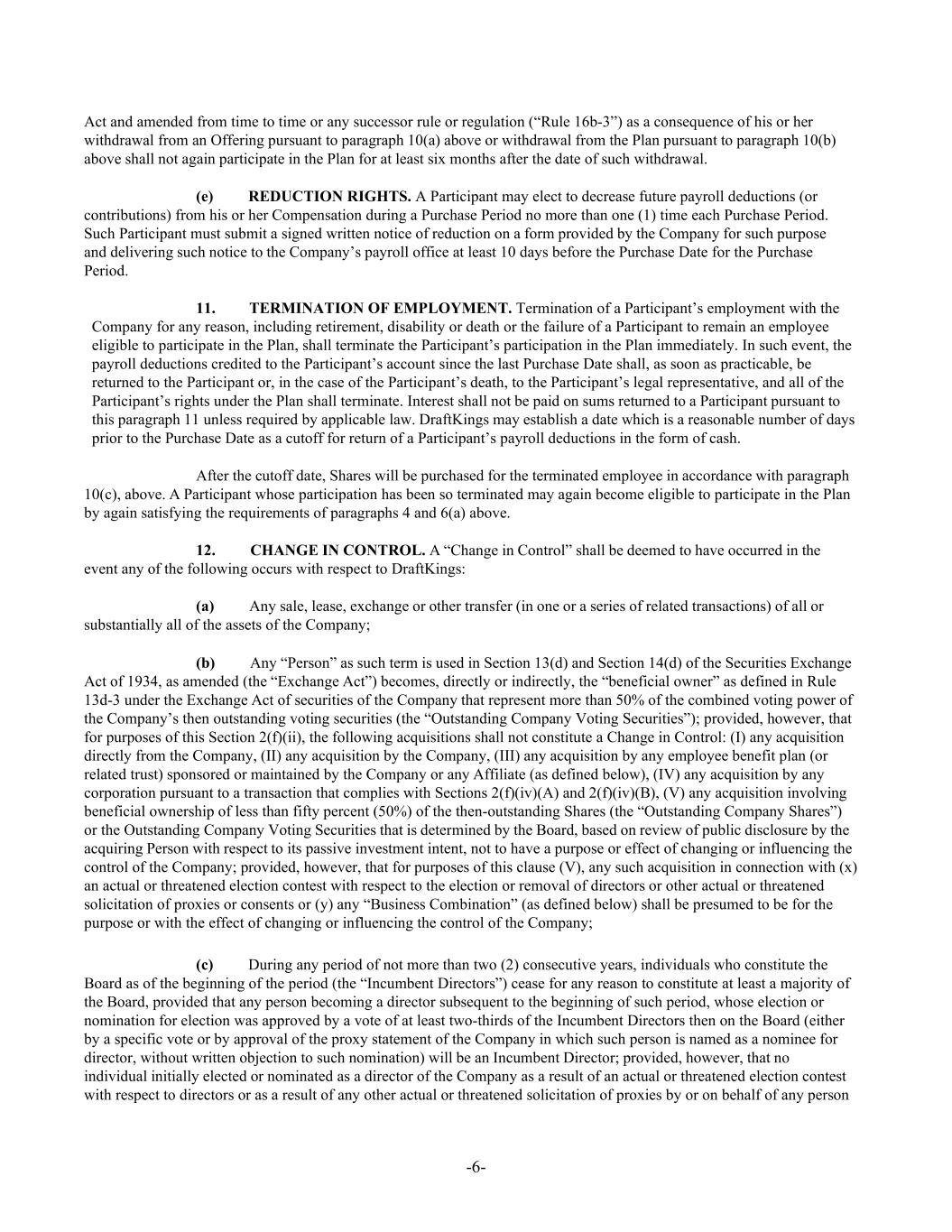 -6- Act and amended from time to time or any successor rule or regulation (“Rule 16b-3”) as a consequence of his or her withdrawal from an Offering pursuant to paragraph 10(a) above or withdrawal from the Plan pursuant to paragraph 10(b) above shall not again participate in the Plan for at least six months after the date of such withdrawal. (e) REDUCTION RIGHTS. A Participant may elect to decrease future payroll deductions (or contributions) from his or her Compensation during a Purchase Period no more than one (1) time each Purchase Period. Such Participant must submit a signed written notice of reduction on a form provided by the Company for such purpose and delivering such notice to the Company’s payroll office at least 10 days before the Purchase Date for the Purchase Period. 11. TERMINATION OF EMPLOYMENT. Termination of a Participant’s employment with the Company for any reason, including retirement, disability or death or the failure of a Participant to remain an employee eligible to participate in the Plan, shall terminate the Participant’s participation in the Plan immediately. In such event, the payroll deductions credited to the Participant’s account since the last Purchase Date shall, as soon as practicable, be returned to the Participant or, in the case of the Participant’s death, to the Participant’s legal representative, and all of the Participant’s rights under the Plan shall terminate. Interest shall not be paid on sums returned to a Participant pursuant to this paragraph 11 unless required by applicable law. DraftKings may establish a date which is a reasonable number of days prior to the Purchase Date as a cutoff for return of a Participant’s payroll deductions in the form of cash. After the cutoff date, Shares will be purchased for the terminated employee in accordance with paragraph 10(c), above. A Participant whose participation has been so terminated may again become eligible to participate in the Plan by again satisfying the requirements of paragraphs 4 and 6(a) above. 12. CHANGE IN CONTROL. A “Change in Control” shall be deemed to have occurred in the event any of the following occurs with respect to DraftKings: (a) Any sale, lease, exchange or other transfer (in one or a series of related transactions) of all or substantially all of the assets of the Company; (b) Any “Person” as such term is used in Section 13(d) and Section 14(d) of the Securities Exchange Act of 1934, as amended (the “Exchange Act”) becomes, directly or indirectly, the “beneficial owner” as defined in Rule 13d-3 under the Exchange Act of securities of the Company that represent more than 50% of the combined voting power of the Company’s then outstanding voting securities (the “Outstanding Company Voting Securities”); provided, however, that for purposes of this Section 2(f)(ii), the following acquisitions shall not constitute a Change in Control: (I) any acquisition directly from the Company, (II) any acquisition by the Company, (III) any acquisition by any employee benefit plan (or related trust) sponsored or maintained by the Company or any Affiliate (as defined below), (IV) any acquisition by any corporation pursuant to a transaction that complies with Sections 2(f)(iv)(A) and 2(f)(iv)(B), (V) any acquisition involving beneficial ownership of less than fifty percent (50%) of the then-outstanding Shares (the “Outstanding Company Shares”) or the Outstanding Company Voting Securities that is determined by the Board, based on review of public disclosure by the acquiring Person with respect to its passive investment intent, not to have a purpose or effect of changing or influencing the control of the Company; provided, however, that for purposes of this clause (V), any such acquisition in connection with (x) an actual or threatened election contest with respect to the election or removal of directors or other actual or threatened solicitation of proxies or consents or (y) any “Business Combination” (as defined below) shall be presumed to be for the purpose or with the effect of changing or influencing the control of the Company; (c) During any period of not more than two (2) consecutive years, individuals who constitute the Board as of the beginning of the period (the “Incumbent Directors”) cease for any reason to constitute at least a majority of the Board, provided that any person becoming a director subsequent to the beginning of such period, whose election or nomination for election was approved by a vote of at least two-thirds of the Incumbent Directors then on the Board (either by a specific vote or by approval of the proxy statement of the Company in which such person is named as a nominee for director, without written objection to such nomination) will be an Incumbent Director; provided, however, that no individual initially elected or nominated as a director of the Company as a result of an actual or threatened election contest with respect to directors or as a result of any other actual or threatened solicitation of proxies by or on behalf of any person