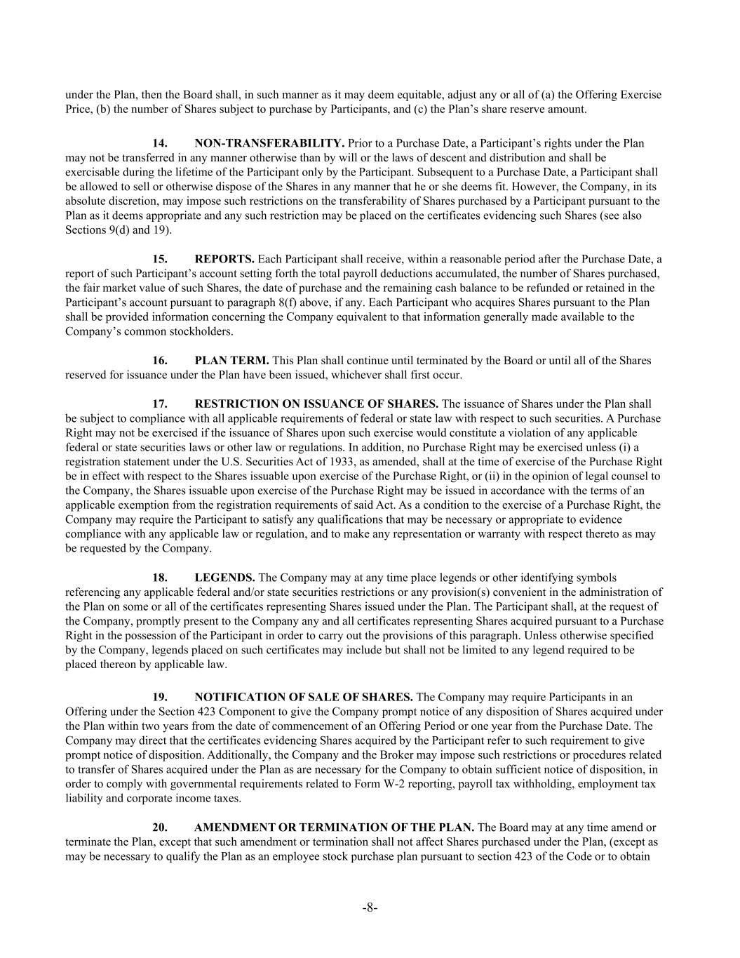 -8- under the Plan, then the Board shall, in such manner as it may deem equitable, adjust any or all of (a) the Offering Exercise Price, (b) the number of Shares subject to purchase by Participants, and (c) the Plan’s share reserve amount. 14. NON-TRANSFERABILITY. Prior to a Purchase Date, a Participant’s rights under the Plan may not be transferred in any manner otherwise than by will or the laws of descent and distribution and shall be exercisable during the lifetime of the Participant only by the Participant. Subsequent to a Purchase Date, a Participant shall be allowed to sell or otherwise dispose of the Shares in any manner that he or she deems fit. However, the Company, in its absolute discretion, may impose such restrictions on the transferability of Shares purchased by a Participant pursuant to the Plan as it deems appropriate and any such restriction may be placed on the certificates evidencing such Shares (see also Sections 9(d) and 19). 15. REPORTS. Each Participant shall receive, within a reasonable period after the Purchase Date, a report of such Participant’s account setting forth the total payroll deductions accumulated, the number of Shares purchased, the fair market value of such Shares, the date of purchase and the remaining cash balance to be refunded or retained in the Participant’s account pursuant to paragraph 8(f) above, if any. Each Participant who acquires Shares pursuant to the Plan shall be provided information concerning the Company equivalent to that information generally made available to the Company’s common stockholders. 16. PLAN TERM. This Plan shall continue until terminated by the Board or until all of the Shares reserved for issuance under the Plan have been issued, whichever shall first occur. 17. RESTRICTION ON ISSUANCE OF SHARES. The issuance of Shares under the Plan shall be subject to compliance with all applicable requirements of federal or state law with respect to such securities. A Purchase Right may not be exercised if the issuance of Shares upon such exercise would constitute a violation of any applicable federal or state securities laws or other law or regulations. In addition, no Purchase Right may be exercised unless (i) a registration statement under the U.S. Securities Act of 1933, as amended, shall at the time of exercise of the Purchase Right be in effect with respect to the Shares issuable upon exercise of the Purchase Right, or (ii) in the opinion of legal counsel to the Company, the Shares issuable upon exercise of the Purchase Right may be issued in accordance with the terms of an applicable exemption from the registration requirements of said Act. As a condition to the exercise of a Purchase Right, the Company may require the Participant to satisfy any qualifications that may be necessary or appropriate to evidence compliance with any applicable law or regulation, and to make any representation or warranty with respect thereto as may be requested by the Company. 18. LEGENDS. The Company may at any time place legends or other identifying symbols referencing any applicable federal and/or state securities restrictions or any provision(s) convenient in the administration of the Plan on some or all of the certificates representing Shares issued under the Plan. The Participant shall, at the request of the Company, promptly present to the Company any and all certificates representing Shares acquired pursuant to a Purchase Right in the possession of the Participant in order to carry out the provisions of this paragraph. Unless otherwise specified by the Company, legends placed on such certificates may include but shall not be limited to any legend required to be placed thereon by applicable law. 19. NOTIFICATION OF SALE OF SHARES. The Company may require Participants in an Offering under the Section 423 Component to give the Company prompt notice of any disposition of Shares acquired under the Plan within two years from the date of commencement of an Offering Period or one year from the Purchase Date. The Company may direct that the certificates evidencing Shares acquired by the Participant refer to such requirement to give prompt notice of disposition. Additionally, the Company and the Broker may impose such restrictions or procedures related to transfer of Shares acquired under the Plan as are necessary for the Company to obtain sufficient notice of disposition, in order to comply with governmental requirements related to Form W-2 reporting, payroll tax withholding, employment tax liability and corporate income taxes. 20. AMENDMENT OR TERMINATION OF THE PLAN. The Board may at any time amend or terminate the Plan, except that such amendment or termination shall not affect Shares purchased under the Plan, (except as may be necessary to qualify the Plan as an employee stock purchase plan pursuant to section 423 of the Code or to obtain