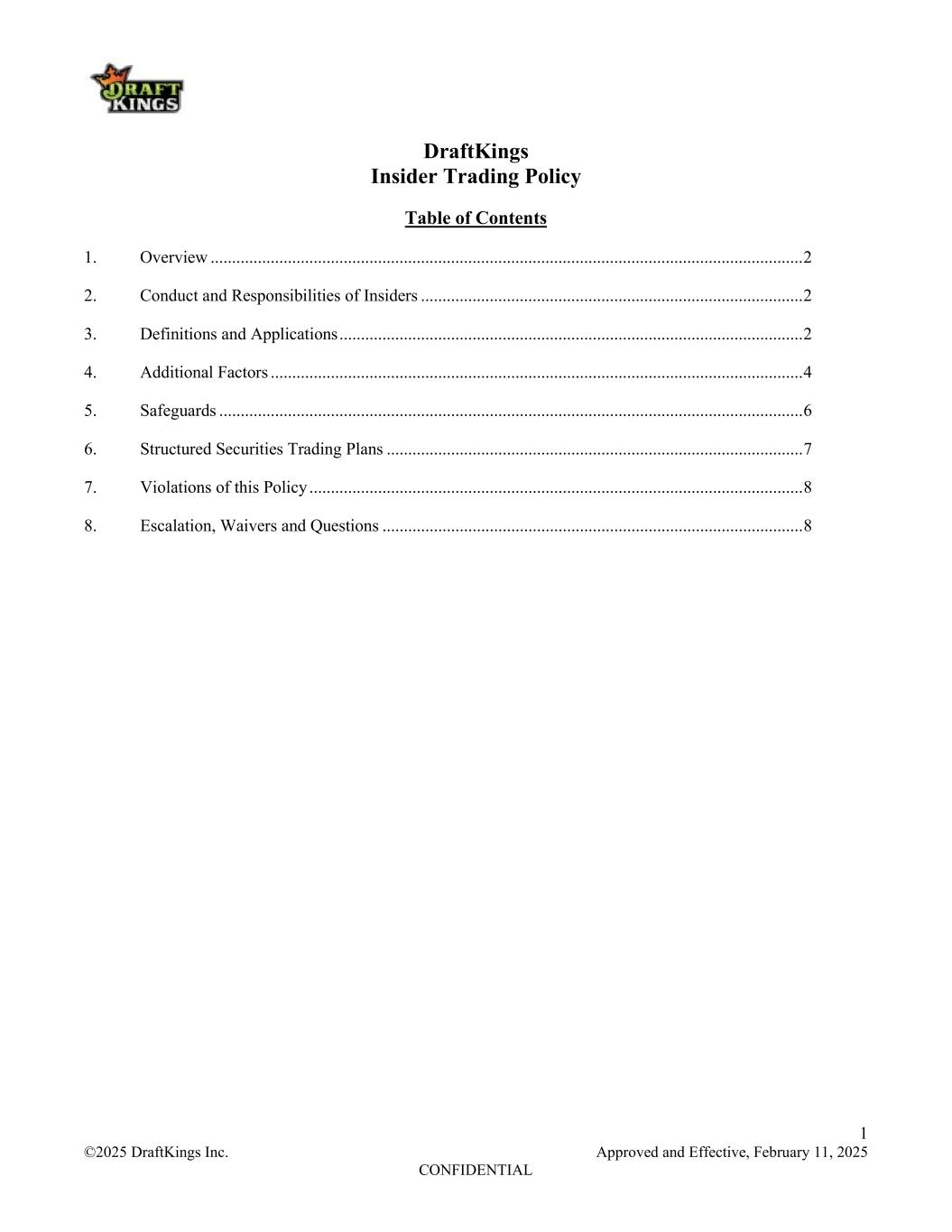 1 ©2025 DraftKings Inc. Approved and Effective, February 11, 2025 CONFIDENTIAL DraftKings Insider Trading Policy Table of Contents 1. Overview .......................................................................................................................................... 2 2. Conduct and Responsibilities of Insiders ......................................................................................... 2 3. Definitions and Applications ............................................................................................................ 2 4. Additional Factors ............................................................................................................................ 4 5. Safeguards ........................................................................................................................................ 6 6. Structured Securities Trading Plans ................................................................................................. 7 7. Violations of this Policy ................................................................................................................... 8 8. Escalation, Waivers and Questions .................................................................................................. 8