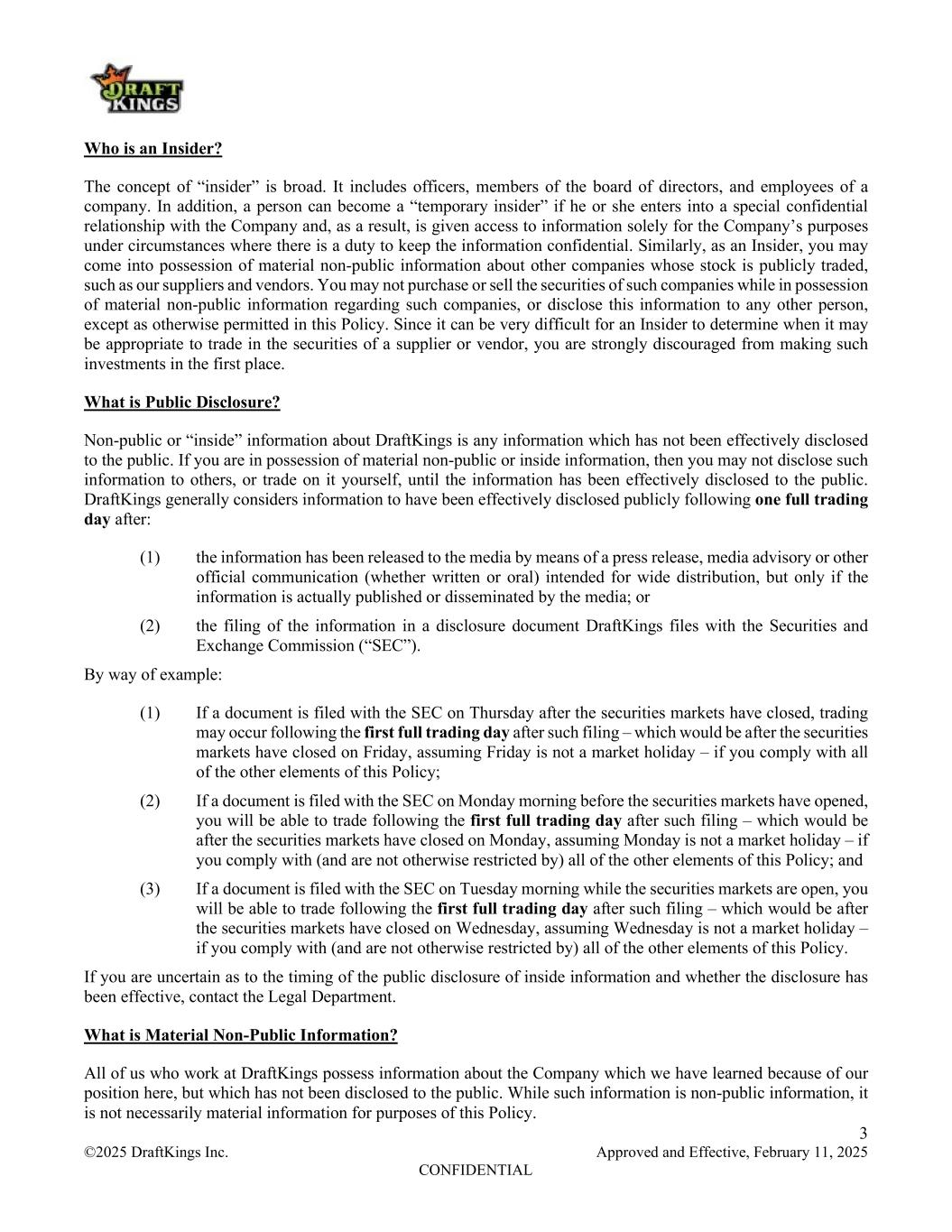 2 ©2025 DraftKings Inc. Approved and Effective, February 11, 2025 CONFIDENTIAL 1. Overview DraftKings Inc. and its subsidiaries (hereinafter referred to as “DraftKings” or the “Company”) have established this policy on insider trading (this “Policy”). The Policy applies to all employees, consultants, independent contractors and officers of DraftKings and to all members of its Board of Directors (collectively, “Insiders”). The Policy places restrictions on trading for all Insiders, including members of the Board of Directors and officers of DraftKings under Section 16 of the Securities Exchange Act of 1934 (the “Exchange Act”, and such directors and officers, “Section 16 Insiders”) and confirms that trading in DraftKings stock may only occur when such individual is NOT in possession of material non-public information. In addition, DraftKings is also prohibited from trading in the Company’s securities based upon material non-public information about itself, consistent with applicable law; provided that this restriction does not apply to transactions pursuant to Rule 10b5-1 (as defined below). 2. Conduct and Responsibilities of Insiders The Policy prohibits insider trading (including “tipping”). If you possess material non-public information, then you are prohibited (by law and by this Policy) from: (1) purchasing, selling or otherwise trading in securities whose market price may be affected by such information, until the information has been effectively disclosed to the public; and (2) disclosing material non-public information to any other person, except to the extent necessary to fulfill the responsibilities of your job, until after such information has been effectively disclosed to the public. This Policy governs trading in all DraftKings stock and options, including both stock exchange-traded options and employee stock options. It also governs trading in any other DraftKings securities (including debt securities), the pledging as collateral of any DraftKings securities (including establishing or increasing margin loans), as well as engaging in transactions in securities of other companies if you learn something in the course of your duties that may affect their value. Note also that the law does not allow you to “guess” whether particular non-public information is positive or negative. For example, if you are aware of DraftKings’ material and non-public financial results, which you believe will result in an increase or decrease in the price of DraftKings’ stock upon announcement, you may not buy or sell until the information has been adequately publicly disclosed, even though you believe you are likely to be “leaving money on the table.” In addition, gifts of DraftKings securities are subject to the restrictions of this Policy. 3. Definitions and Applications What is Insider Trading? Insider trading is not defined in the written law, but courts generally have described it as: (1) trading of securities by an “insider” on the basis of material and non-public information; (2) communicating material and non-public information by an insider to others (“tipping”); or (3) use (by trading or tipping) of material and non-public information by a non-insider in violation of a duty to keep it confidential.