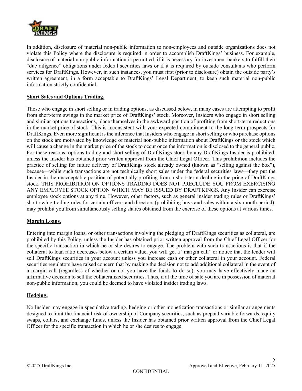 5 ©2025 DraftKings Inc. Approved and Effective, February 11, 2025 CONFIDENTIAL In addition, disclosure of material non-public information to non-employees and outside organizations does not violate this Policy where the disclosure is required in order to accomplish DraftKings’ business. For example, disclosure of material non-public information is permitted, if it is necessary for investment bankers to fulfill their “due diligence” obligations under federal securities laws or if it is required by outside consultants who perform services for DraftKings. However, in such instances, you must first (prior to disclosure) obtain the outside party’s written agreement, in a form acceptable to DraftKings’ Legal Department, to keep such material non-public information strictly confidential. Short Sales and Options Trading. Those who engage in short selling or in trading options, as discussed below, in many cases are attempting to profit from short-term swings in the market price of DraftKings’ stock. Moreover, Insiders who engage in short selling and similar options transactions, place themselves in the awkward position of profiting from short-term reductions in the market price of stock. This is inconsistent with your expected commitment to the long-term prospects for DraftKings. Even more significant is the inference that Insiders who engage in short selling or who purchase options on the stock are motivated by knowledge of material non-public information about DraftKings or the stock which will cause a change in the market price of the stock to occur once the information is disclosed to the general public. For these reasons, options trading and short selling of DraftKings stock by any DraftKings Insider is prohibited, unless the Insider has obtained prior written approval from the Chief Legal Officer. This prohibition includes the practice of selling for future delivery of DraftKings stock already owned (known as “selling against the box”), because––while such transactions are not technically short sales under the federal securities laws––they put the Insider in the unacceptable position of potentially profiting from a short-term decline in the price of DraftKings stock. THIS PROHIBITION ON OPTIONS TRADING DOES NOT PRECLUDE YOU FROM EXERCISING ANY EMPLOYEE STOCK OPTION WHICH MAY BE ISSUED BY DRAFTKINGS. Any Insider can exercise employee stock options at any time. However, other factors, such as general insider trading rules or DraftKings’ short-swing trading rules for certain officers and directors (prohibiting buys and sales within a six-month period), may prohibit you from simultaneously selling shares obtained from the exercise of these options at various times. Margin Loans. Entering into margin loans, or other transactions involving the pledging of DraftKings securities as collateral, are prohibited by this Policy, unless the Insider has obtained prior written approval from the Chief Legal Officer for the specific transaction in which he or she desires to engage. The problem with such transactions is that if the collateral to loan ratio decreases below a certain value, you will get a “margin call” or notice that the lender will sell DraftKings securities in your account unless you increase cash or other collateral in your account. Federal securities regulators have raised concern that by making the decision not to add additional collateral in the event of a margin call (regardless of whether or not you have the funds to do so), you may have effectively made an affirmative decision to sell the collateralized securities. Thus, if at the time of sale you are in possession of material non-public information, you could be deemed to have violated insider trading laws. Hedging. No Insider may engage in speculative trading, hedging or other monetization transactions or similar arrangements designed to limit the financial risk of ownership of Company securities, such as prepaid variable forwards, equity swaps, collars, and exchange funds, unless the Insider has obtained prior written approval from the Chief Legal Officer for the specific transaction in which he or she desires to engage.